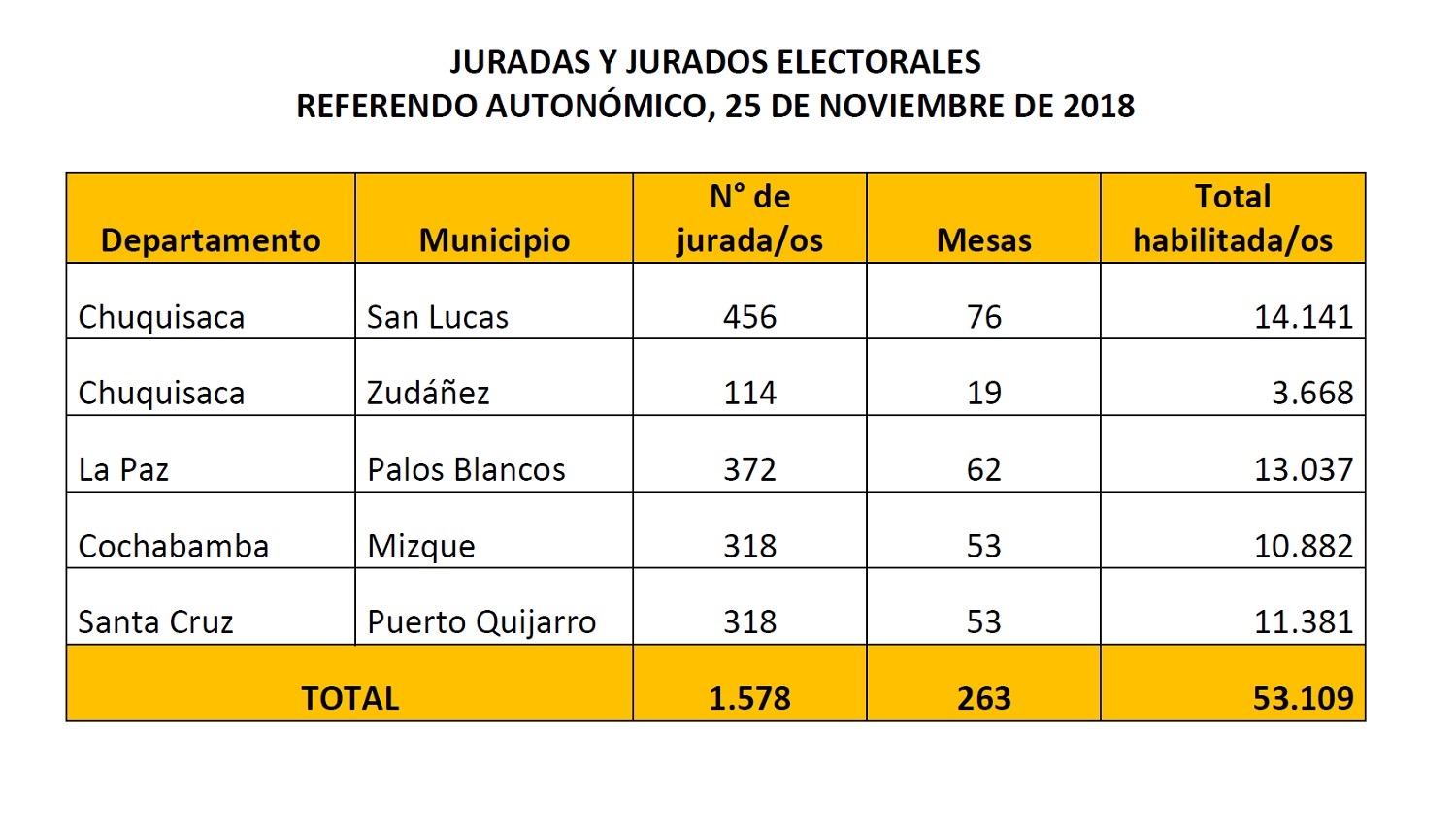El sorteo de se realizó en cumplimiento de la actividad 28 del Calendario Electoral, y sobre la base de un Padrón Electoral de 53.109 de personas que fueron habilitadas para participar en la consulta en los municipios de San Lucas y Zudáñez en Chuquisaca, Palos Blancos en La Paz, Mizque en Cochabamba y Puerto Quijarro en Santa Cruz.