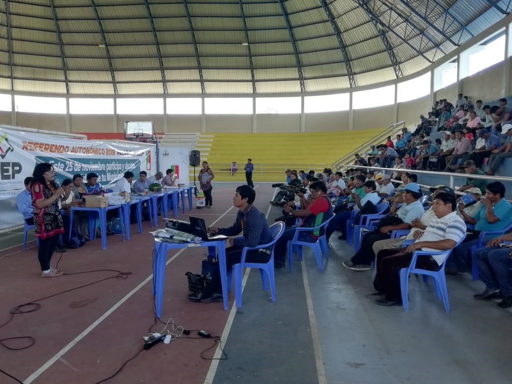 El Tribunal Electoral Departamental (TED) de La Paz desarrolló una serie de reuniones con más de 3.500 pobladores de Palos Blancos, a quienes se informó acerca de la naturaleza y alcance del Referendo Autonómico que se realizará el domingo 25 de octubre en este municipio, donde se decidirá sobre la vigencia o no de su proyecto de Carta Orgánica Municipal.
