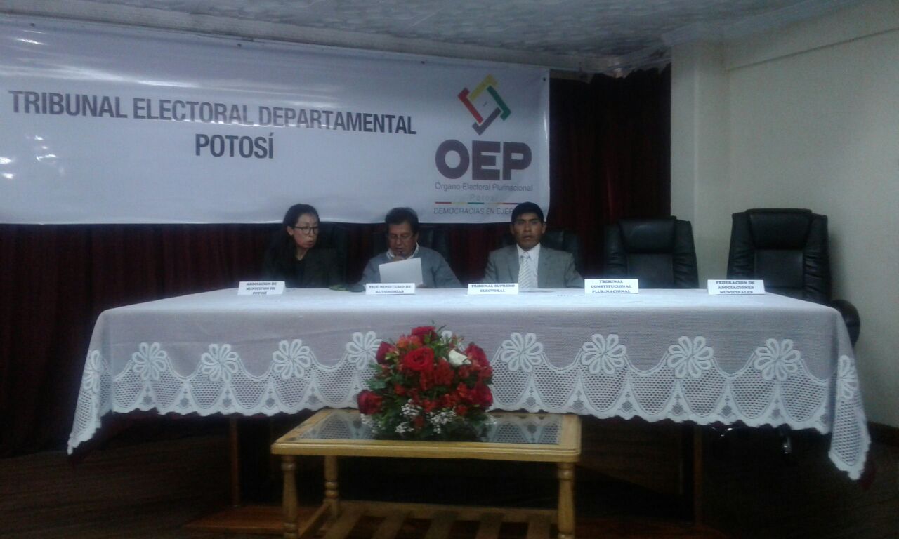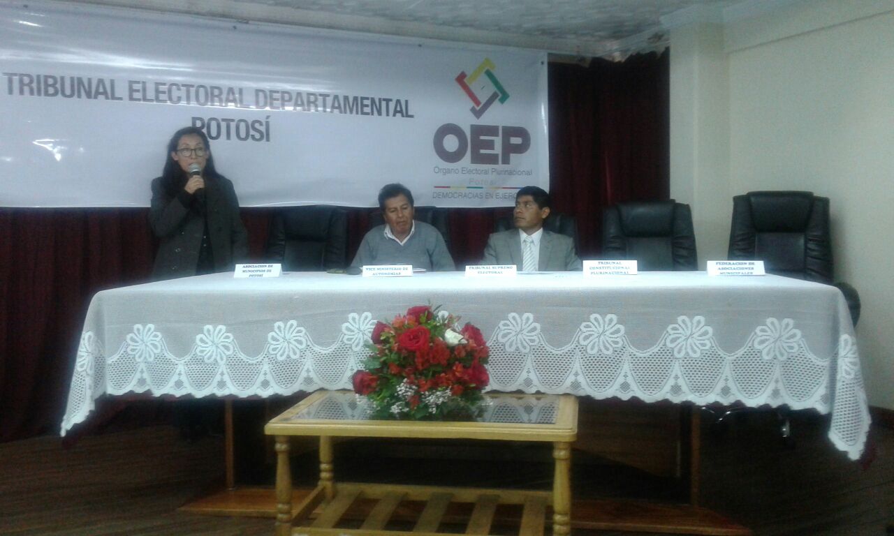 El vocal del TSE, Idelfonso Mamani, fue en encargado de inaugurar el evento donde también intervinieron el Director Departamental de Autonomías, Samuel Rosales; el representante del TCP, Isaac Mauricio Navarro; y la Directora Ejecutiva de la Asociación de Municipios de Potosí (AMDEPO), Betzabé Saavedra.