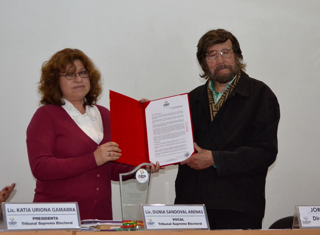 El Órgano Electoral Plurinacional (OEP) aprobó la Resolución TSE RSP-0480/2016 de 5 de octubre de 2016, a través de la cual otorga un reconocimiento y rinde homenaje al cineasta boliviano Jorge Sanjinés Aramayo, por “su trayectoria profesional comprometida y militante con la recuperación de la democracia en el país”.