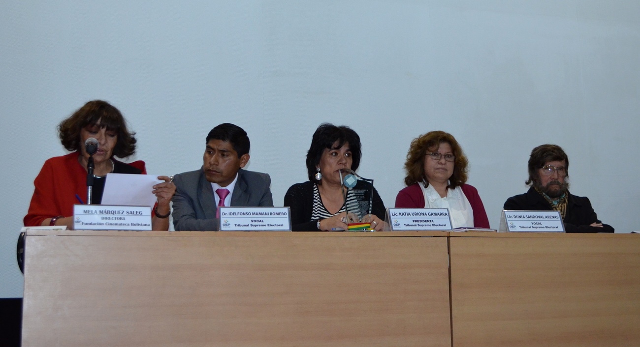 “Su invalorable trabajo desde la producción cinematográfica ha logrado no solo retratar sino también inspirar las luchas sociales para reconquistar el Estado de Derecho y, con justicia social e igualdad, abrir el camino para ir construyendo esta democracia intercultural, diversa y plural que es de todas y todos”, señaló la presidenta del TSE, Katia Uriona al entregar el galardón.