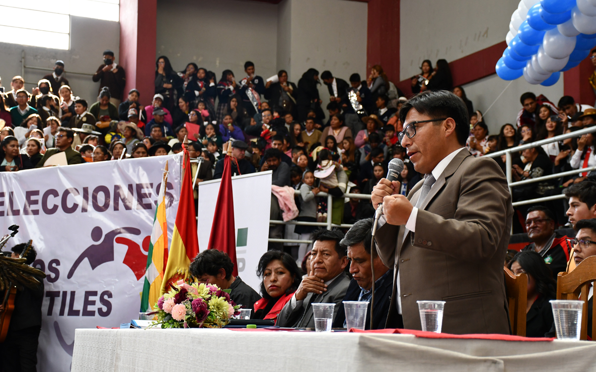 En el acto de Entrega de Credenciales y Posesión de Gobiernos y Defensores Estudiantiles, en el colegio Juan Misael Saracho, el presidente del TED Oruro recomendó a los representantes electos realizar una gestión integradora entre todos.