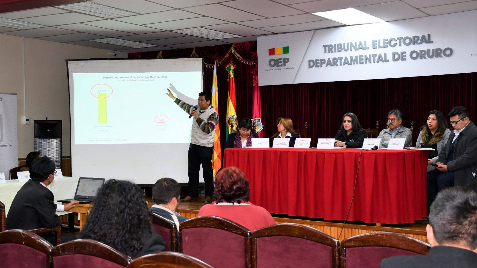 A su turno, el vocal Tahuichi Tahuichi realizó una breve reseña histórica de la consolidación de la democracia en Bolivia, y puntualizó los hitos más importantes desde la fundación del Estado boliviano hasta ahora. El Vocal compartió con el público un análisis para mejorar la calidad de la democracia y comentó que existen factores dentro la sociedad como los económicos, que influyen en la cualificación del sistema democrático, por lo que el desarrollo social debe ser integral.