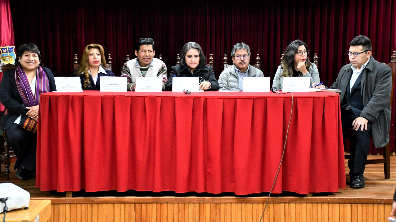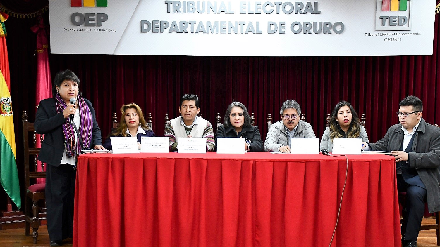 Vicepresidenta del TSE, Nancy Gutérrez, vocales del TSE, Tahuichi Tahuchi Quispe y Dina Chuquimia; presidenta del TED Oruro, Zelma López y el representante del PNUD, Alberto Cruz.