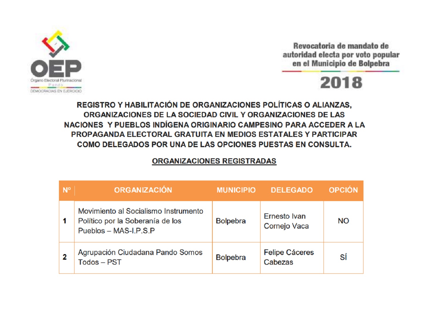 La autoridad informó que ambas organizaciones políticas realizarán la difusión de propaganda entre el 26 de noviembre y el 12 de diciembre, según los procedimientos establecidos en el Reglamento de Difusión de Propaganda.De la misma forma, la autoridad informó que el 27 de octubre el TED Pando publicó una lista de 14 personas que fueron depuradas del Padrón Electoral de Bolpebra, de las cuales 13 casos se deben a que tras ser sorteados para ejercer como juradas o jurados electorales no asistieron a cumplir con esta función, y una inhabilitación se debe a una posible doble identidad.