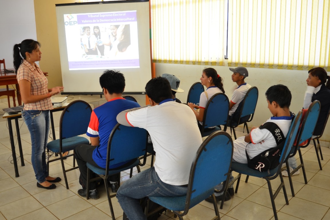 Las y los estudiantes recibieron, primero, una capacitación sobre el concepto y las características de la Democracia Intercultural y sobre las tres formas de democracias reconocidas en la Constitución Política del Estado: la Democracia Representativa, Participativa y Comunitaria; la exposición fue desarrollada por las y los técnicos del Servicio Intercultural de Fortalecimiento Democrático (SIFDE) del TED Pando.