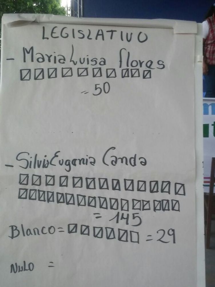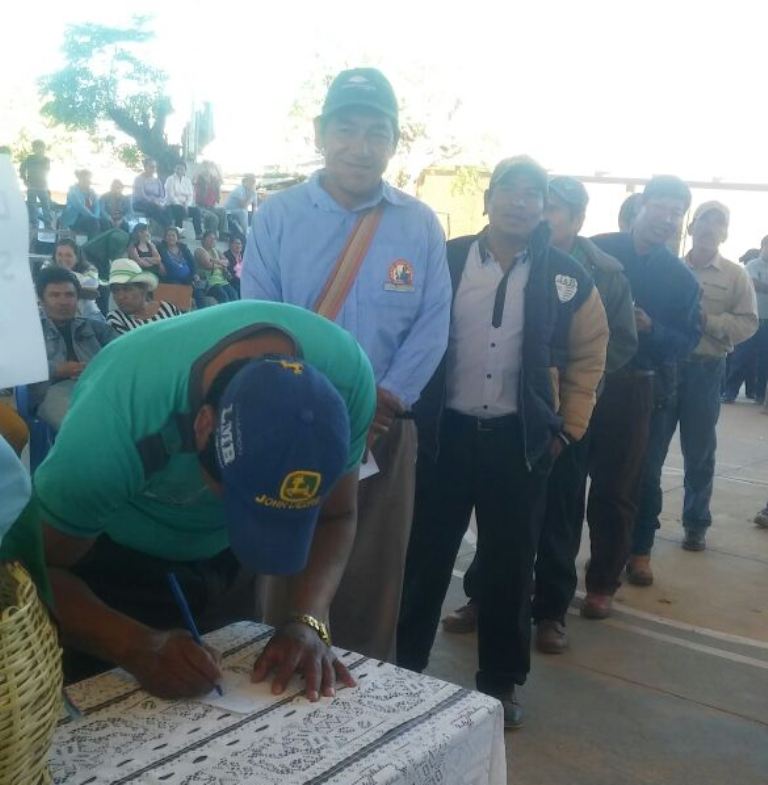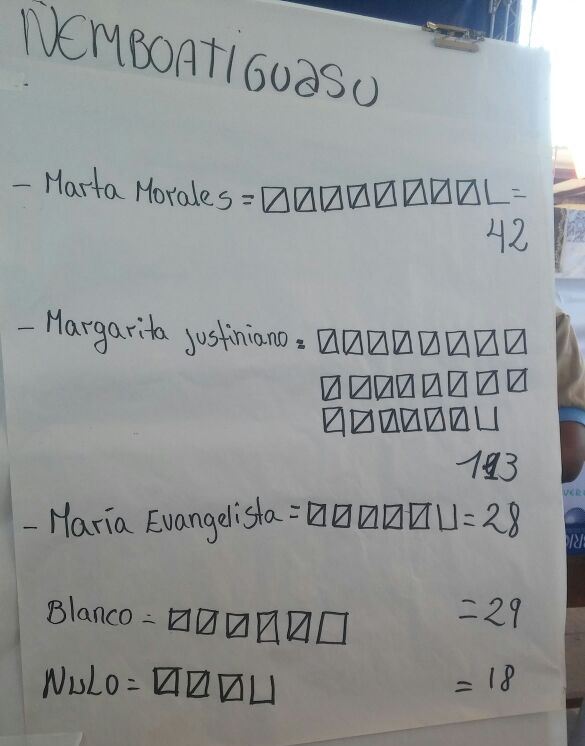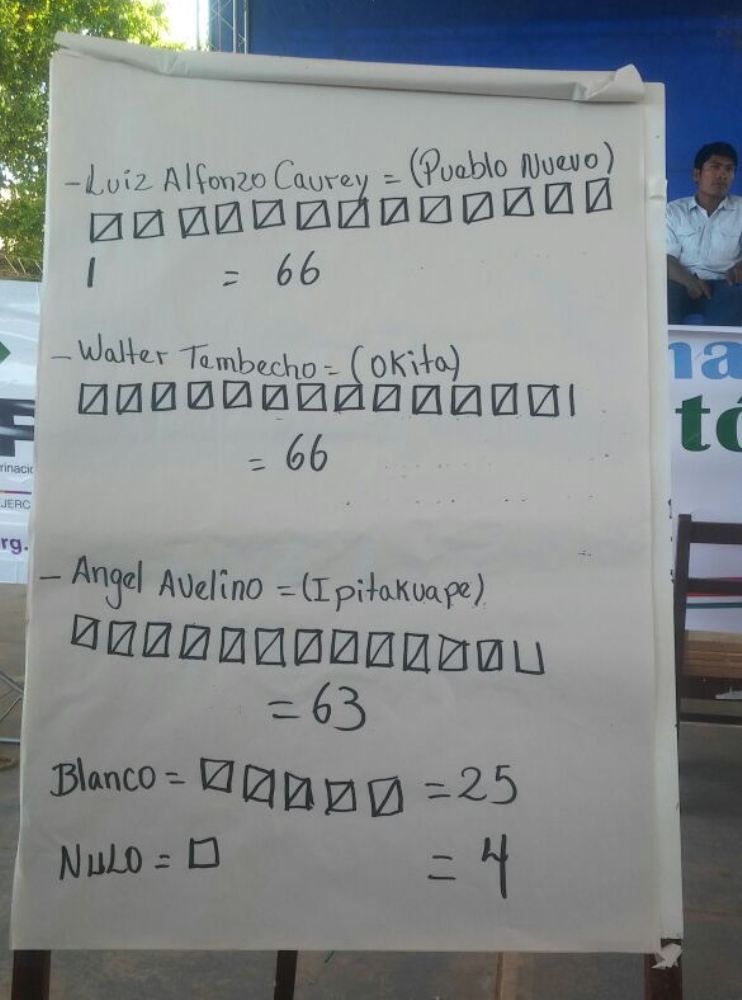 Así, en la votación que se realizó hoy, en dos rondas para cada Órgano de Gobierno (primero las candidatas y luego los candidatos), resultaron electos como miembros para el Órgano de Decisión Colectiva (Ñemboati Reta) Martha Morales con 42 votos, Margarita Justiniano con 113, ambas de la comunidad San Antonio Parapetí; Alfonso Caurey de la comunidad Pueblo Nuevo y Walter Tembecho de la comunidad Okita, con 66 votos cada uno.