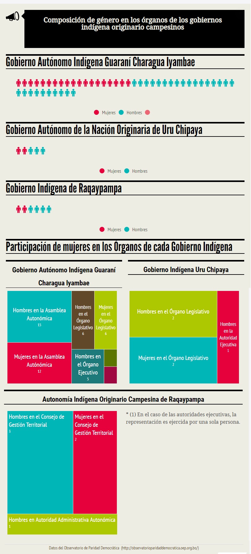 Según los datos recopilados por el Observatorio de Paridad Democrática del Órgano Electoral Plurinacional (OEP), en los tres gobiernos indígenas conformados hasta el momento (Charagua Iyambae, en Santa Cruz; Raqaypampa, en Cochabamba; Uru Chipaya, en Oruro) la representación paritaria está compuesta de la siguiente forma:
