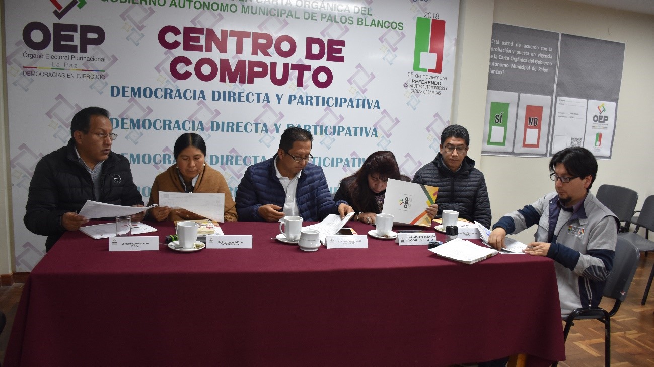 La Sala Plena del Tribunal Electoral Departamental (TED) de La Paz dio a conocer este lunes que en el municipio de Palos Blancos la opción del NO al proyecto de Carta Orgánica Municipal logró el apoyo del 56,15%(4.409) de la ciudadanía, frente al 43.85% (3.443) de apoyo que logró la opción del Sí.