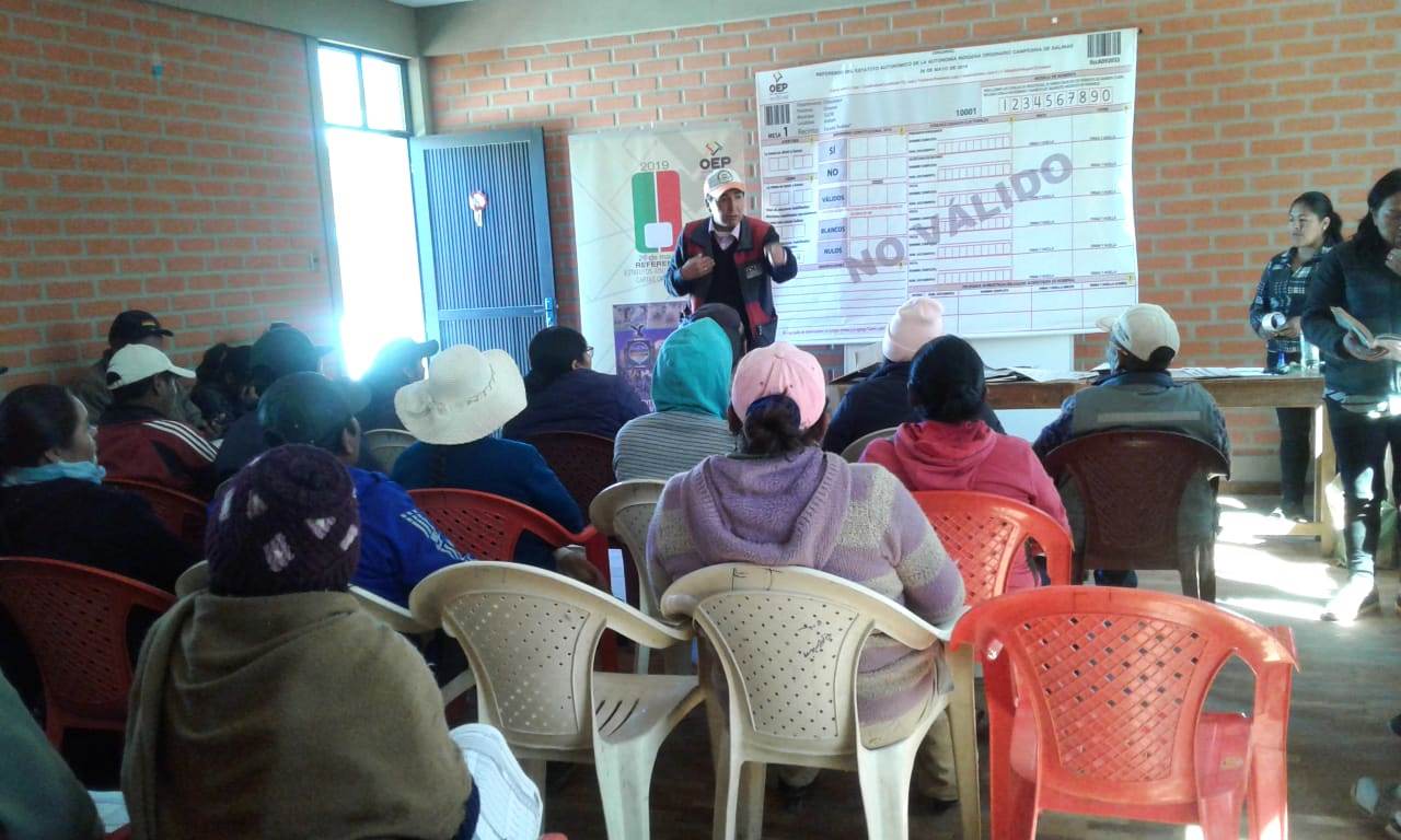 “Este miércoles 15 de mayo la brigada del TED Oruro visitó la comunidad de Aroma, donde capacitó a 27 jurados de 16 mesas electorales de las comunidades de Villa Esperanza, Puqui y Aroma, donde se constituirán en recintos electorales en el día del Referendo”, añadió la autoridad.