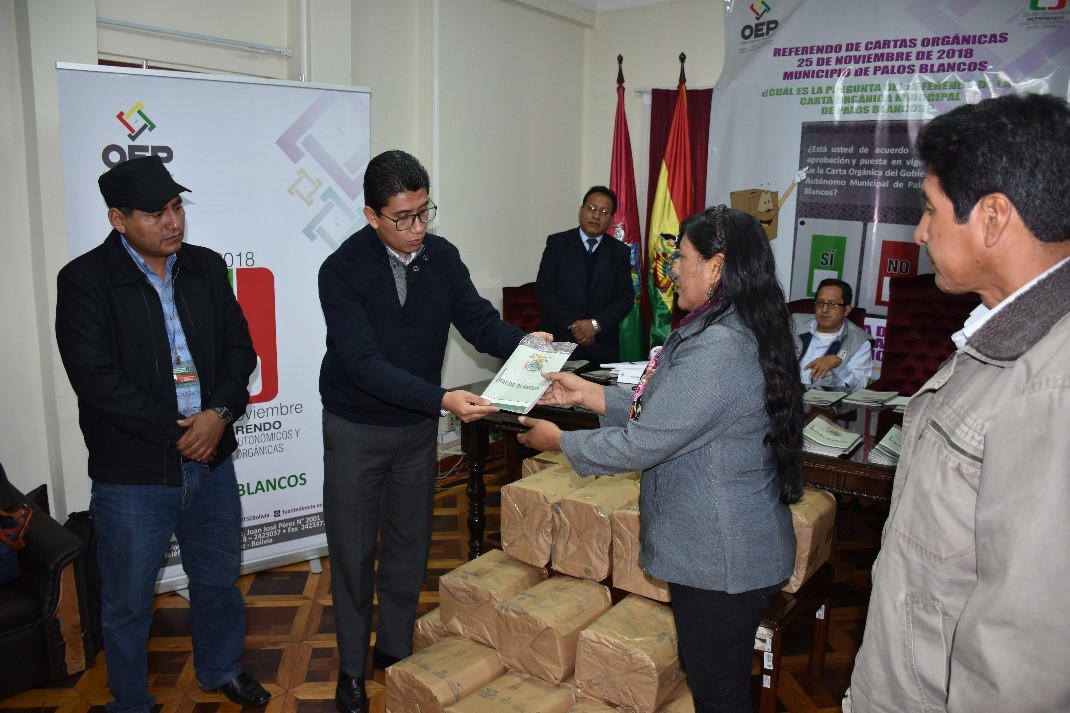A fin de apoyar el proceso de socialización del proyecto de Carta Orgánica Municipal de Palos Blancos, la Sala Plena del Tribunal Electoral Departamental (TED) de La Paz entregó este jueves a las autoridades del municipio un lote de 12 mil ejemplares, de los más de 29 mil que se imprimieron del proyecto norma que será sometido a consulta ciudadana durante el Referendo Autonómico del 25 de noviembre.
