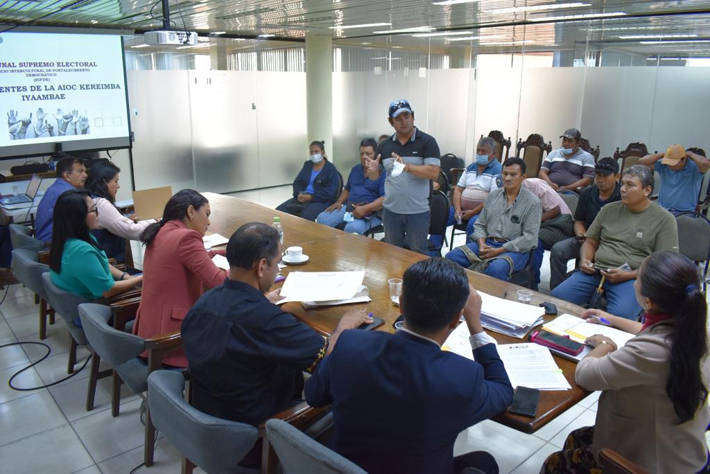 Los vocales del Tribunal Supremo Electoral (TSE), Francisco Vargas y Yajaira San Martín, en compañía de vocales del Tribunal Electoral Departamental (TED) de Santa Cruz, participaron en una mesa técnica, con miembros pertenecientes a la Zona Urbana-Campesina de la Autonomía Indígena Originario Campesina (AIOC) Kereimba Iyaambae, con el fin de analizar los procedimientos para la elección de sus representantes ante el Ñeamboti Guasu (Gran Asamblea).