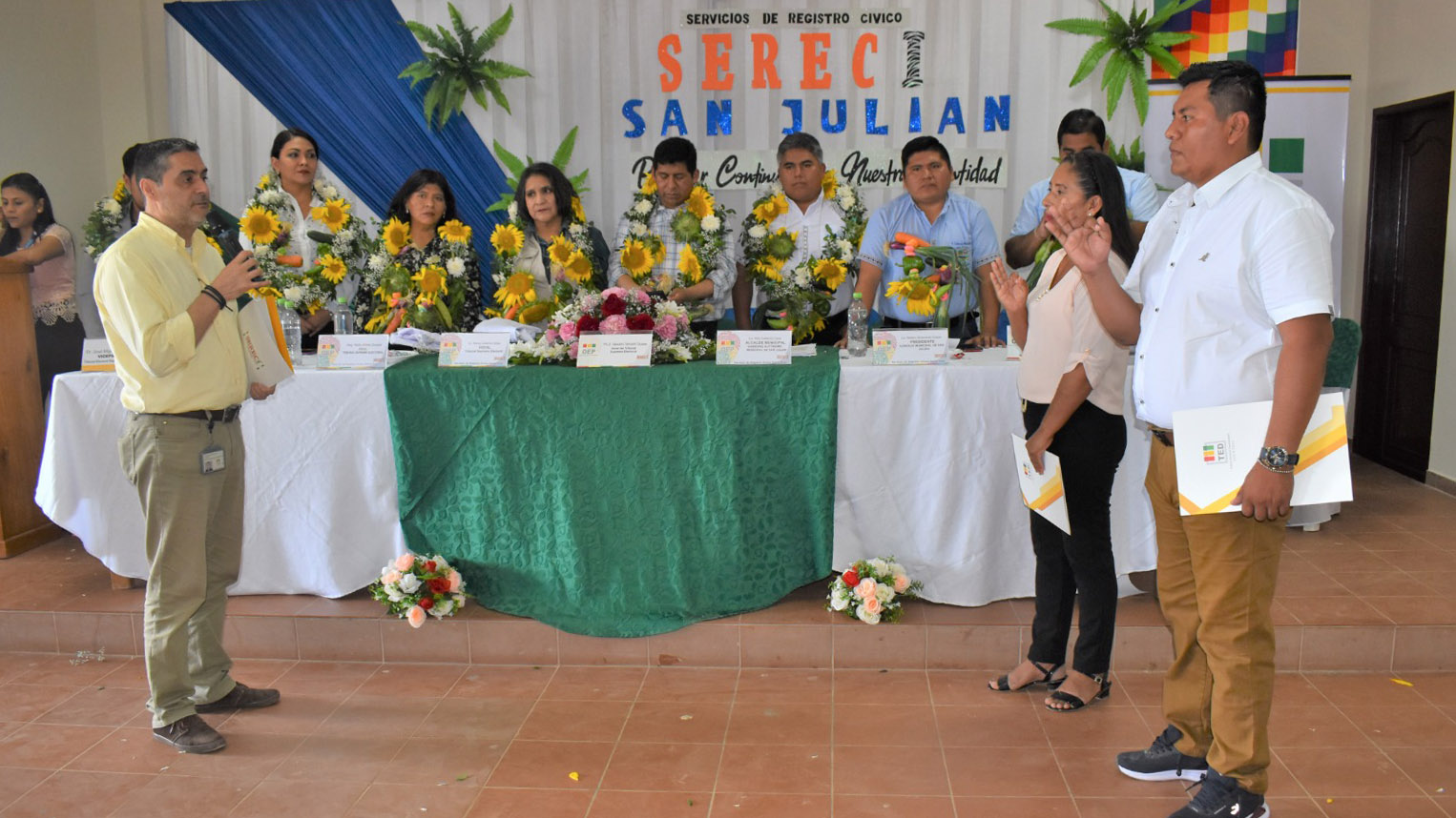 En la oportunidad, se posesionó también a dos nuevos oficiales de registro civil que cumplirán sus tareas en el municipio de San Julián. En el acto, la presidenta del Tribunal Electoral Departamental de Santa Cruz, María Cristina Claros, precisó: “Los oficiales de registro civil son los representantes del Órgano Electoral Plurinacional que van a tener dentro el municipio, para dar fe pública de todos los actos jurídicos y vitales que se registren”.
