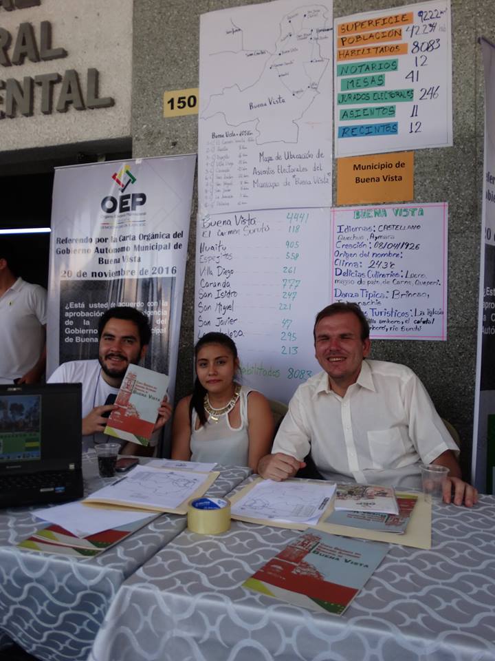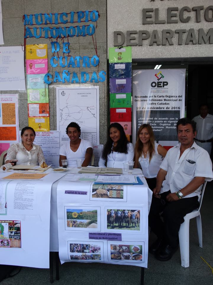 La ocasión fue propicia para que brindar información sobre cada uno de los seis municipios que serán parte del Referendo Constitucional del 20 de noviembre en Santa Cruz: El Torno, El Puente, Yapacaní, Buena Vista, Cuatro Cañadas y Gutiérrez, quienes instalaron su stand con información del proceso referendario y la carta orgánica que someterán a consulta.