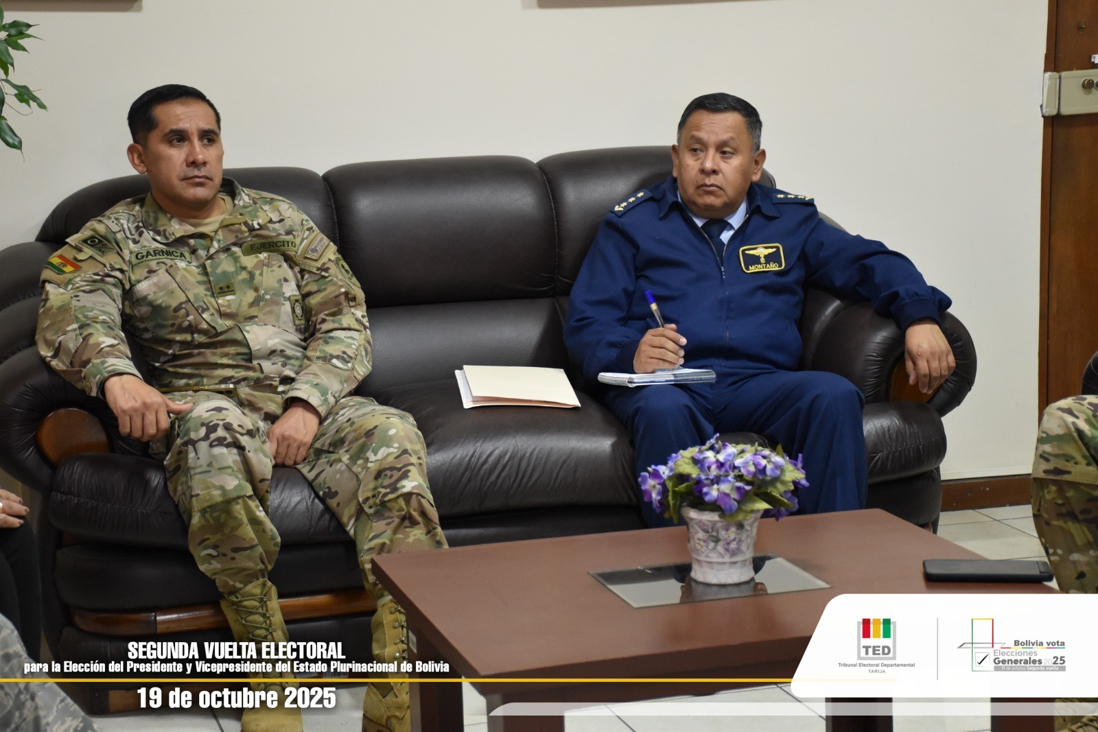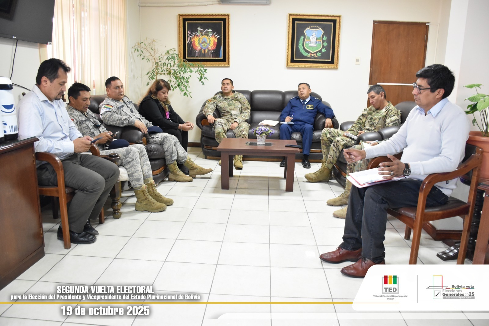 La reunión se desarrolló este lunes 6 de octubre en instalaciones del TED Tarija y contó con la participación de efectivos de la Tercera División del Ejército, con sede en Villa Montes; del Área Naval Nro. 3 “Bermejo” y de la Fuerza Aérea Boliviana. La actividad estuvo encabezada por el presidente del TED Tarija, Óscar Gutiérrez Sánchez, junto a los vocales Alicia Durán y Andrés Cuevas.