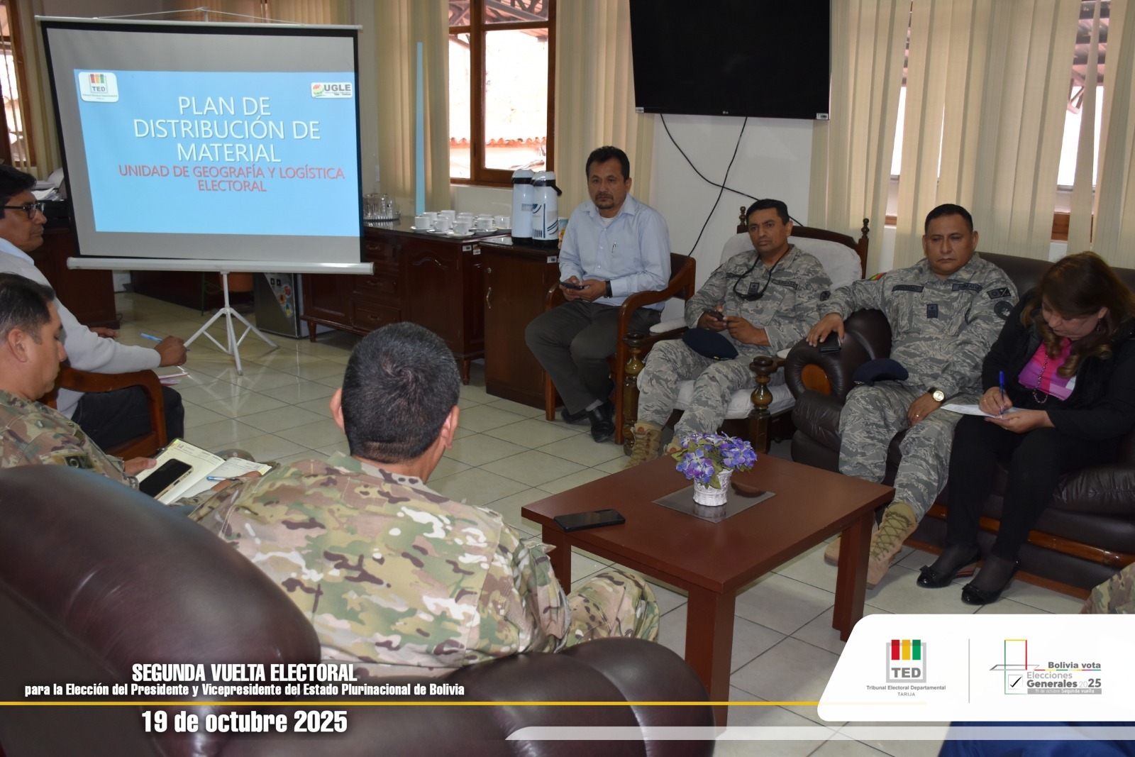 En el marco de la segunda vuelta electoral de las Elecciones Generales 2025, el Tribunal Electoral Departamental (TED) de Tarija sostuvo una reunión de coordinación con representantes de las unidades militares acantonadas en el departamento, con el propósito de definir los detalles del plan de distribución del material electoral para la jornada del 19 de octubre.