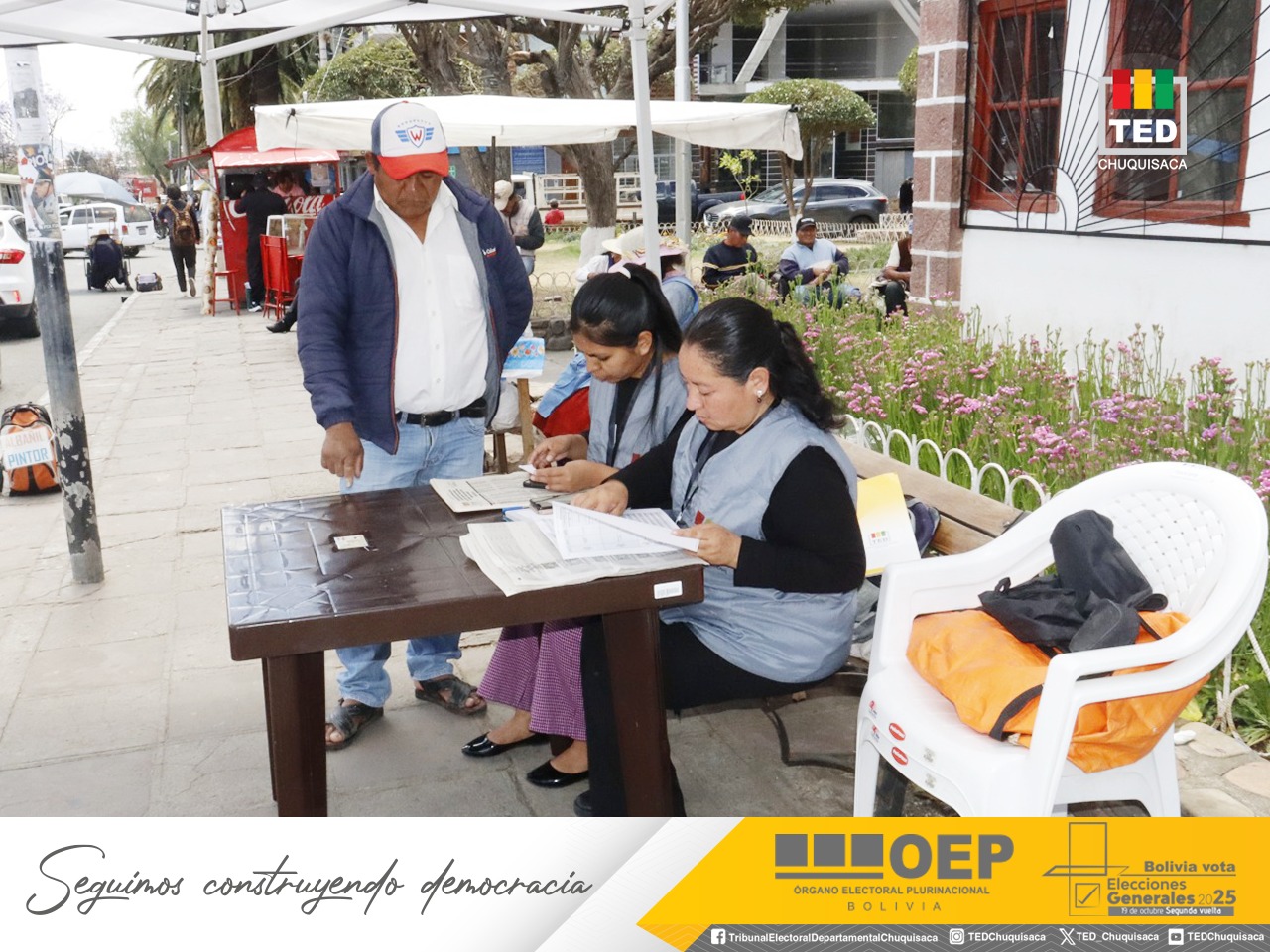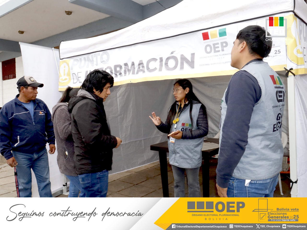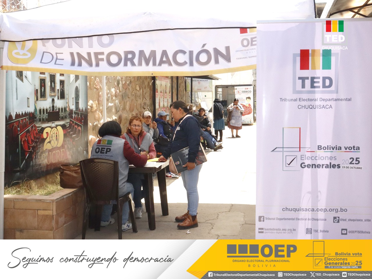 El Tribunal Electoral Departamental (TED) de Chuquisaca, a través del Servicio Intercultural de Fortalecimiento Democrático (Sifde), implementa seis puntos de información distribuidos en zonas estratégicas de la ciudad con el objetivo de orientar a la ciudadanía sobre la segunda vuelta de las Elecciones Generales 2025, que se desarrollarán el 19 de octubre.