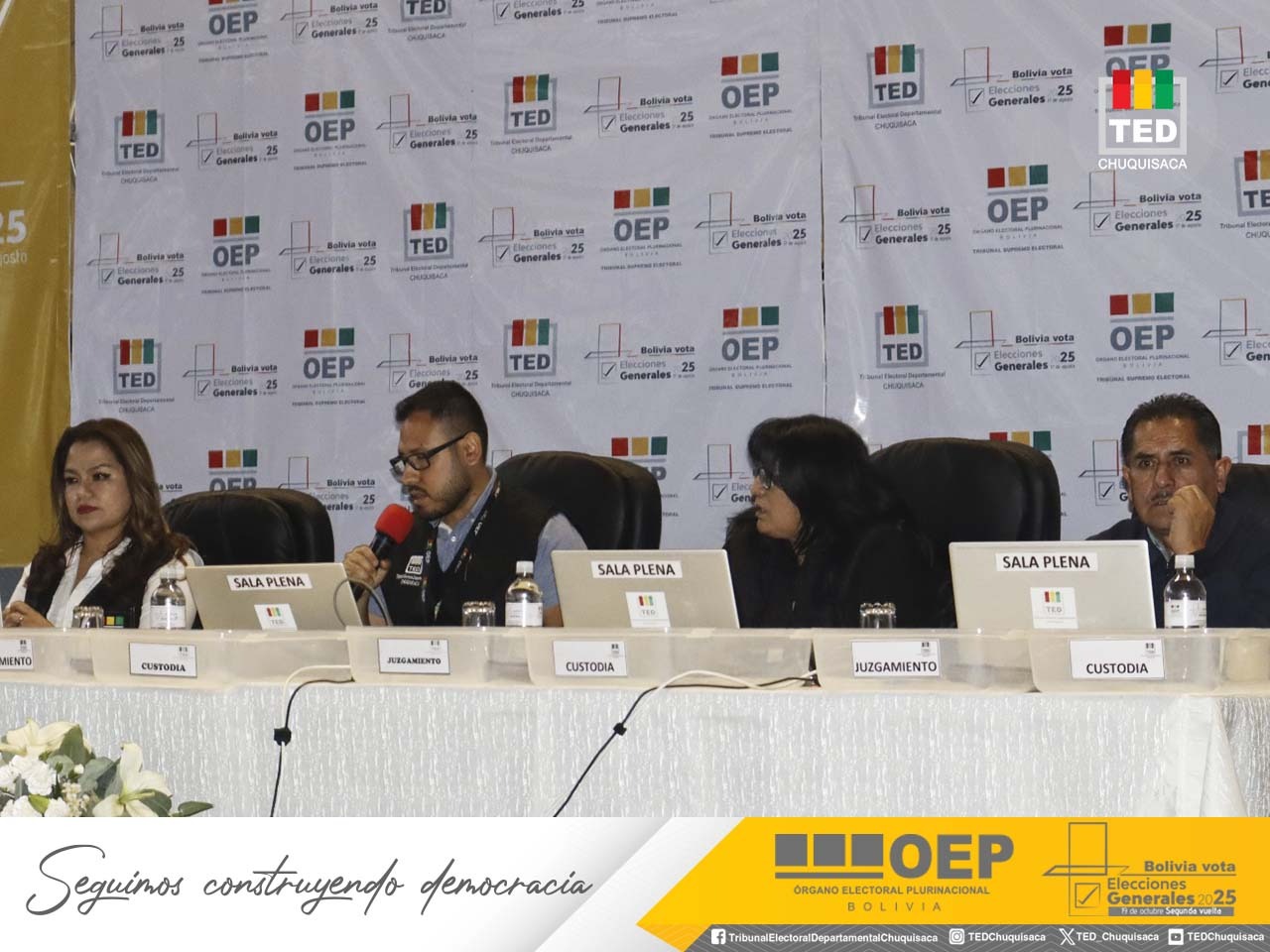 La Sala Plena contó con la presencia del presidente del TED Chuquisaca, Mauricio del Río; de la vicepresidenta Lidia Rivas y de los vocales Ximena Camacho y Edil Martínez. Está ausente el vocal Gunnar Vargas por motivos de salud.