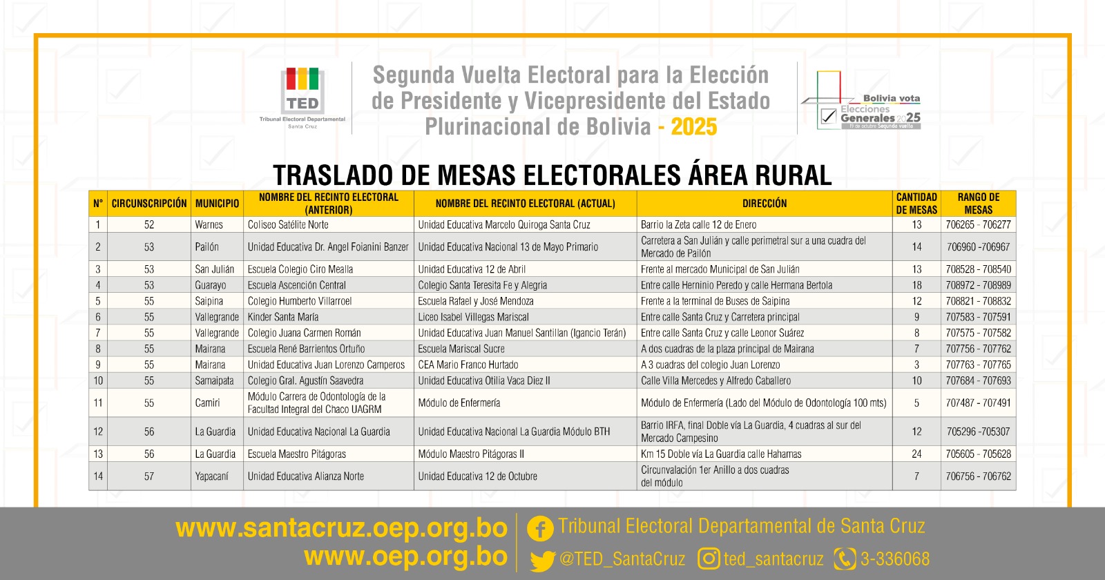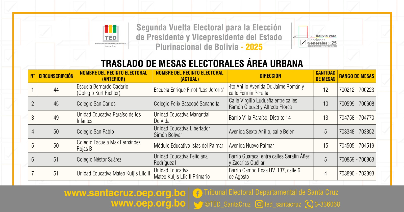 Con el objetivo de brindar a las y los electores mejores condiciones para la emisión del voto, el Tribunal Electoral Departamental (TED) de Santa Cruz trasladó 21 recintos electorales y 219 mesas de sufragio para la segunda vuelta electoral de las Elecciones Generales 2025, programada para el domingo 19 de octubre.