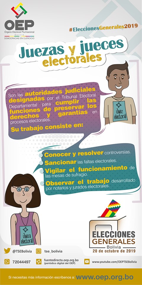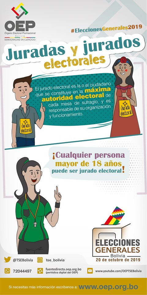 De acuerdo a la Ley N° 018 del Órgano Electoral Plurinacional (OEP), las juradas y jurados, notarias y notarios y juezas y jueces electorales forman parte de la estructura del OEP; mientras que los guías, y las delegadas y delegados de organizaciones políticas así como de las misiones de observación serán designados por sus respectivas organizaciones e instituciones.