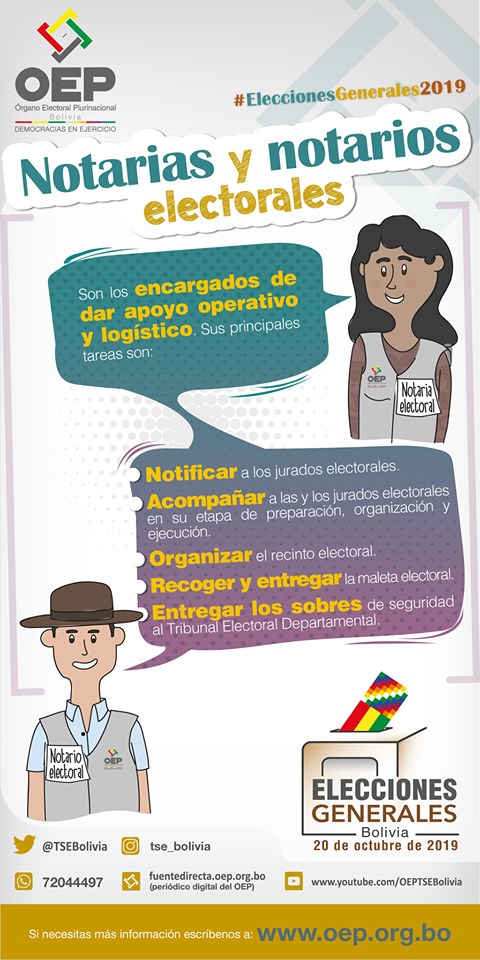 Las y los notarios son los encargados de brindar apoyo operativo y logístico; siendo los responsables de notificar a las y los jurados electorales, acompañarlos en su etapa de preparación y organización, organizar el recinto electoral, recoger y entregar la maleta electoral, acompañar en el trabajo a las y los jurados electorales y proporcionar los sobres de seguridad al Tribunal Electoral Departamental (TED), entre otros. Serán designados, el 20 de septiembre, en el país por los TED correspondientes y en el exterior por el Tribunal Supremo Electoral (TSE).