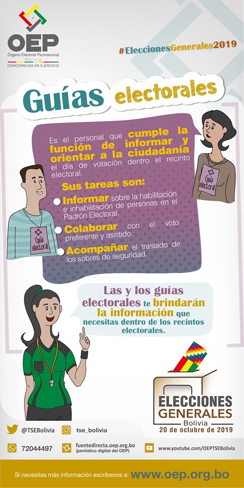 Las y los guías electorales, si bien no forman parte de la estructura del OEP, también se constituyen en actores fundamentales, porque en los recintos electorales informarán y orientarán a la ciudadanía sobre su habilitación o inhabilitación en el Padrón Electoral, ayudarán con el voto preferente y el voto asistido, y acompañarán el traslado de los sobres de seguridad cuando sea necesario.
