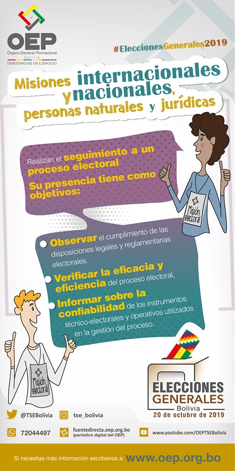 Finalmente, las y los miembros de las misiones de observación internacional, nacional, personas naturales y jurídicas realizarán el seguimiento al proceso electoral. Su presencia tiene el objetivo de observar el cumplimiento de las disposiciones legales y reglamentarias electorales bolivianas; verificar la eficacia y eficiencia de la organización, dirección, supervisión, administración y ejecución del proceso electoral; e informar sobre la confiabilidad de los instrumentos técnico-operativos utilizados en la gestión del proceso.