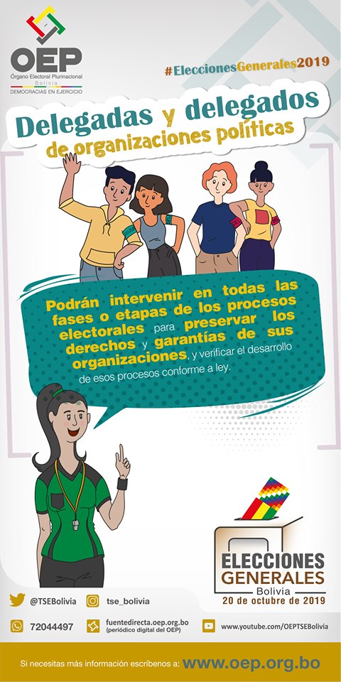 Por su lado, las y los delegados de las organizaciones políticas, quienes serán designados por los partidos políticos y alianzas habilitadas para participar en las Elecciones Generales 2019, podrán intervenir en todas las fases del proceso electoral para preservar los derechos y garantías de sus organizaciones, y verificar el desarrollo del proceso conforme a Ley. Su ausencia o falta de participación no impide la realización de los actos y procedimientos, ni conlleva la invalidez de los mismos.