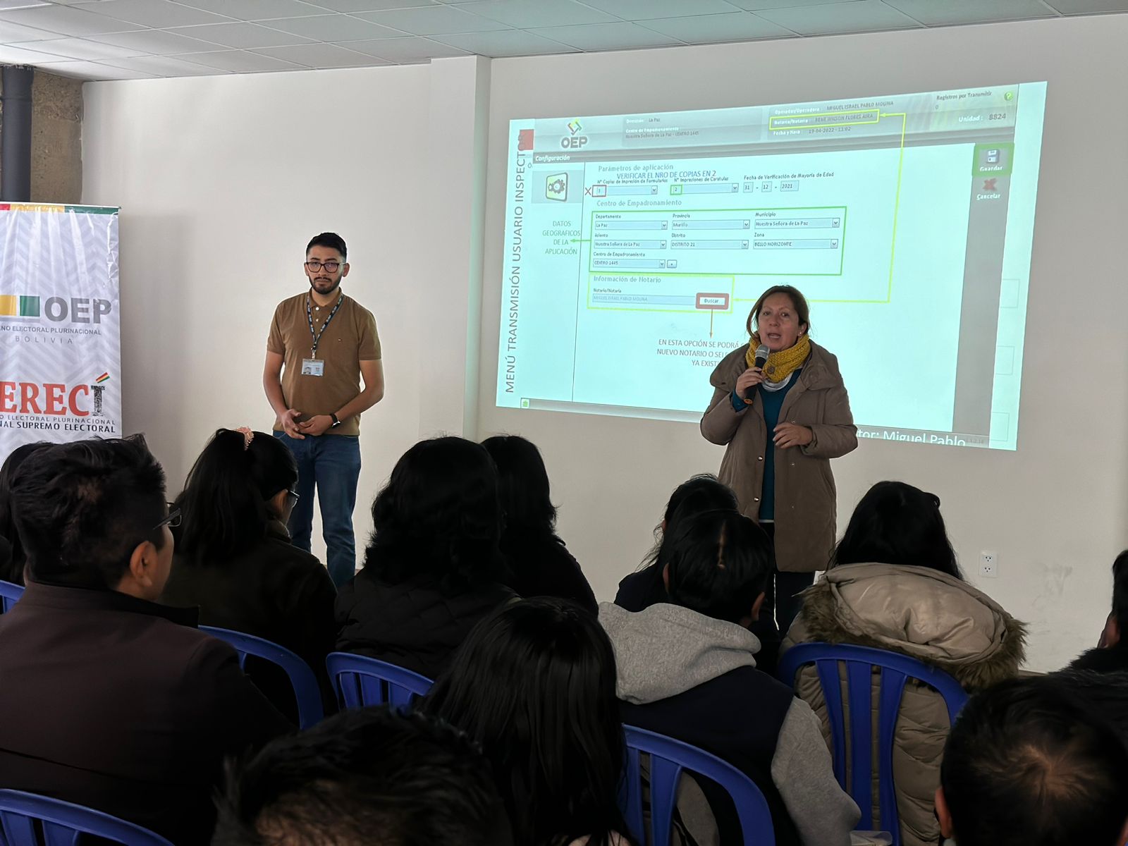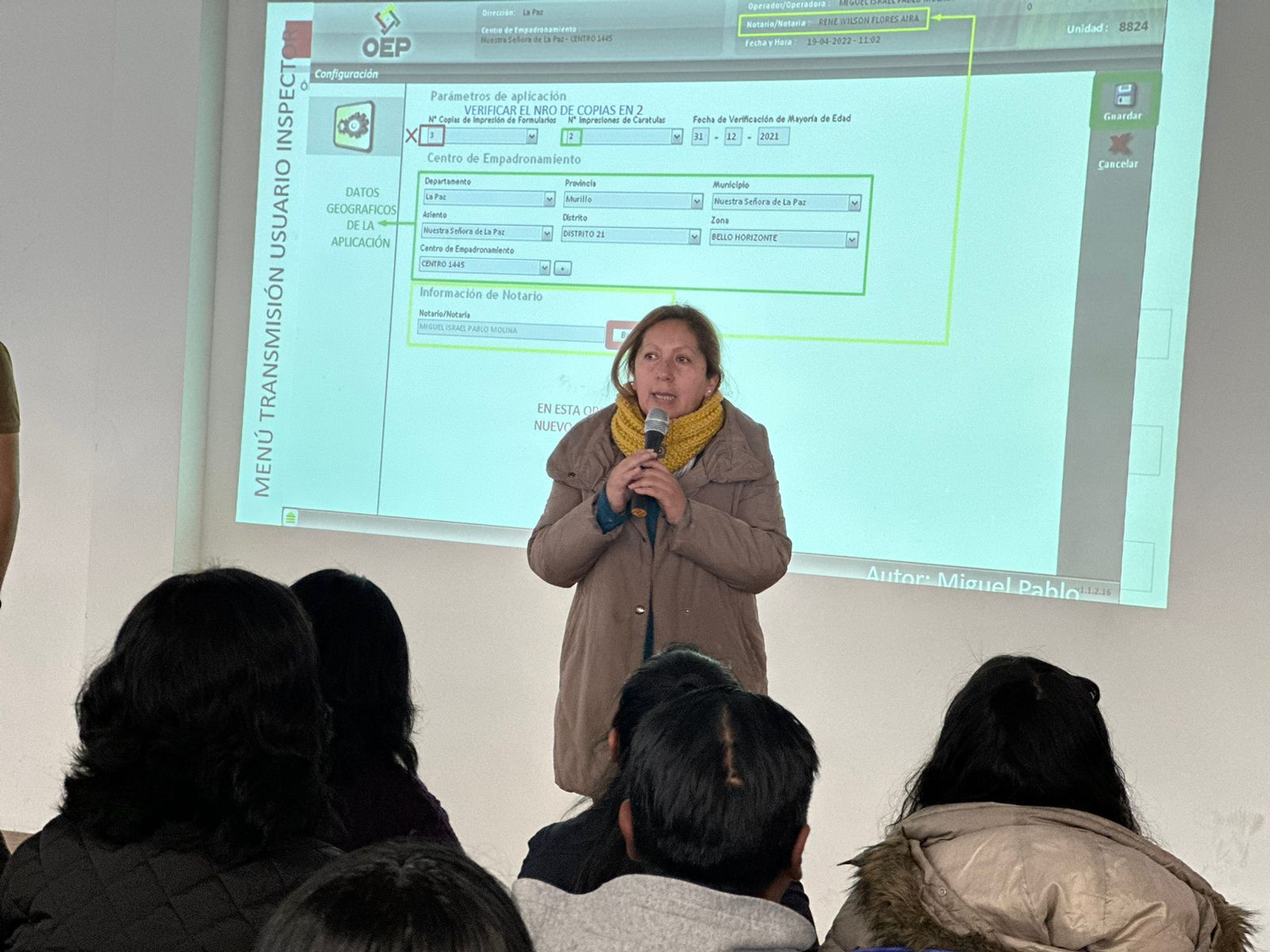 En la oportunidad, la directora departamental del Serecí La Paz, Ángela Gómez, pidió a los funcionarios atender a la población con calidad y calidez. La capacitación teórica y práctica se desarrolló en grupos, debido a la cantidad de personas, y estuvo dirigida a coordinadores electorales y notarios operadores, tanto urbanos como rurales; técnicos de soporte informativo, auxiliares técnicos, administrativos financieros, técnicos logísticos y técnicos en comunicación, para un buen desempeño en las labores de empadronamiento.