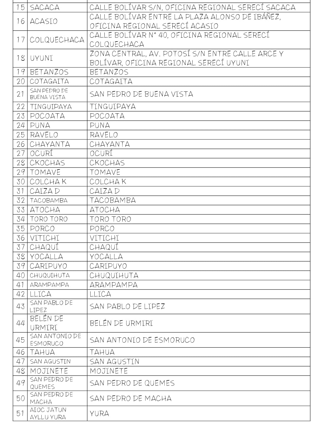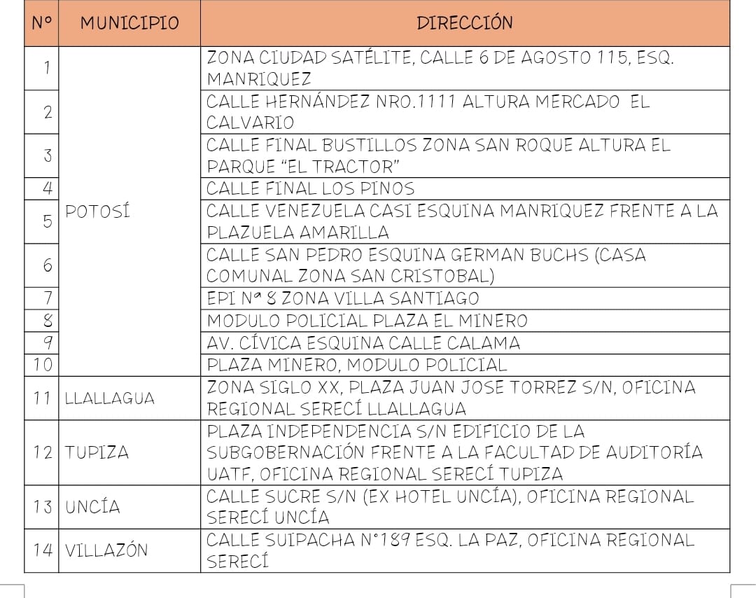 El director departamental del Serecí Potosí, Kieffer Condori, informó que para cumplir dicho objetivo se habilitarán 51 puntos fijos y 66 puntos móviles en todo el departamento, y aseguró que con esta planificación alcanzarán el 90 % de asientos electorales que en el departamento, con lo que se cubrirá el 100 % de asientos concentrados en localidades cercanas de mayor población.