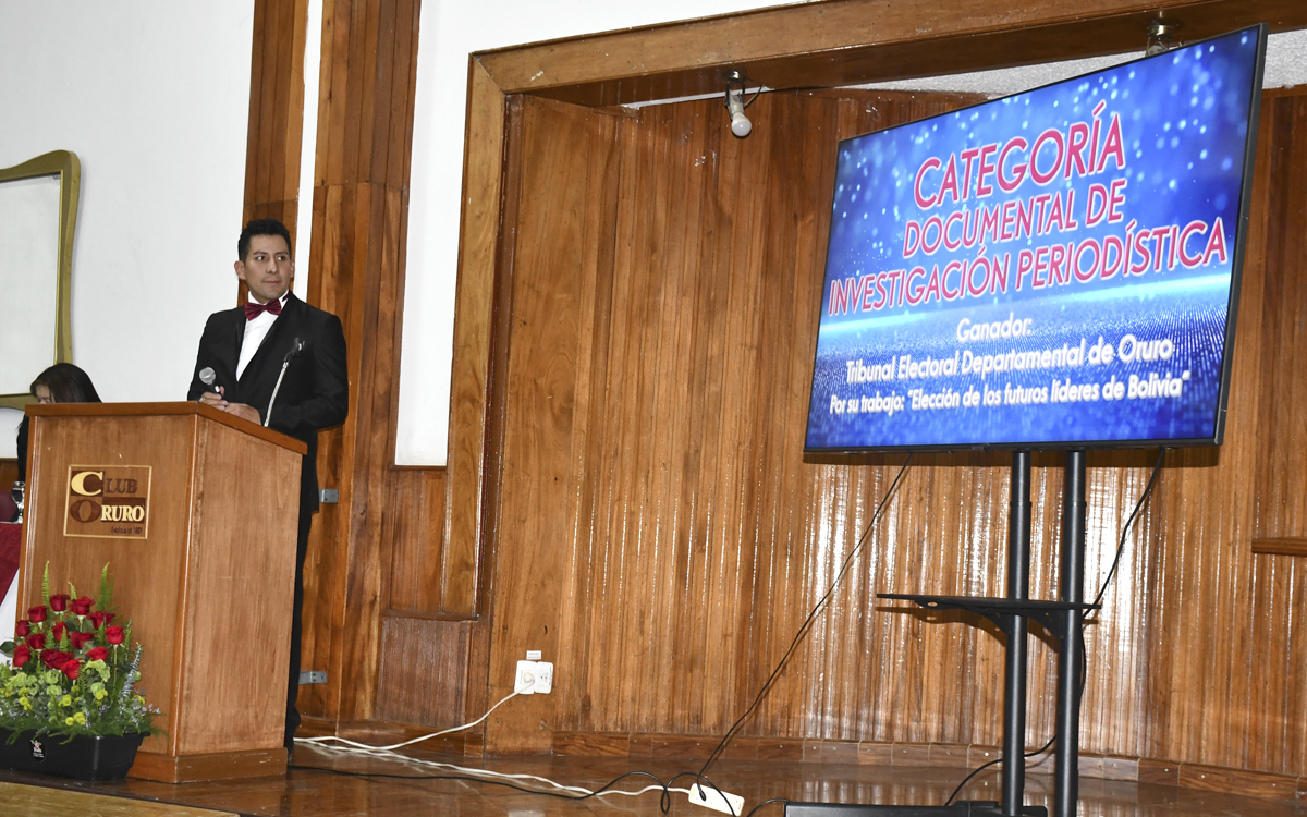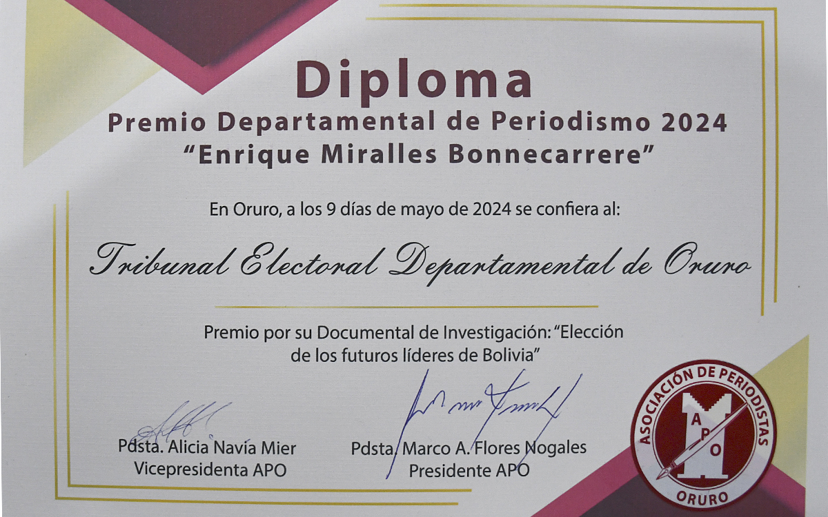 El trabajo periodístico titulado Elecciones de los Futuros Líderes de Bolivia, realizado por el Servicio Intercultural de Fortalecimiento Democrático (Sifde) del Tribunal Electoral Departamental (TED) de Oruro, ganó en la categoría documental de investigación el Premio Departamental de Periodismo Enrique Miralles Bonnecarrere 2024, organizado por la Asociación de Periodistas de Oruro