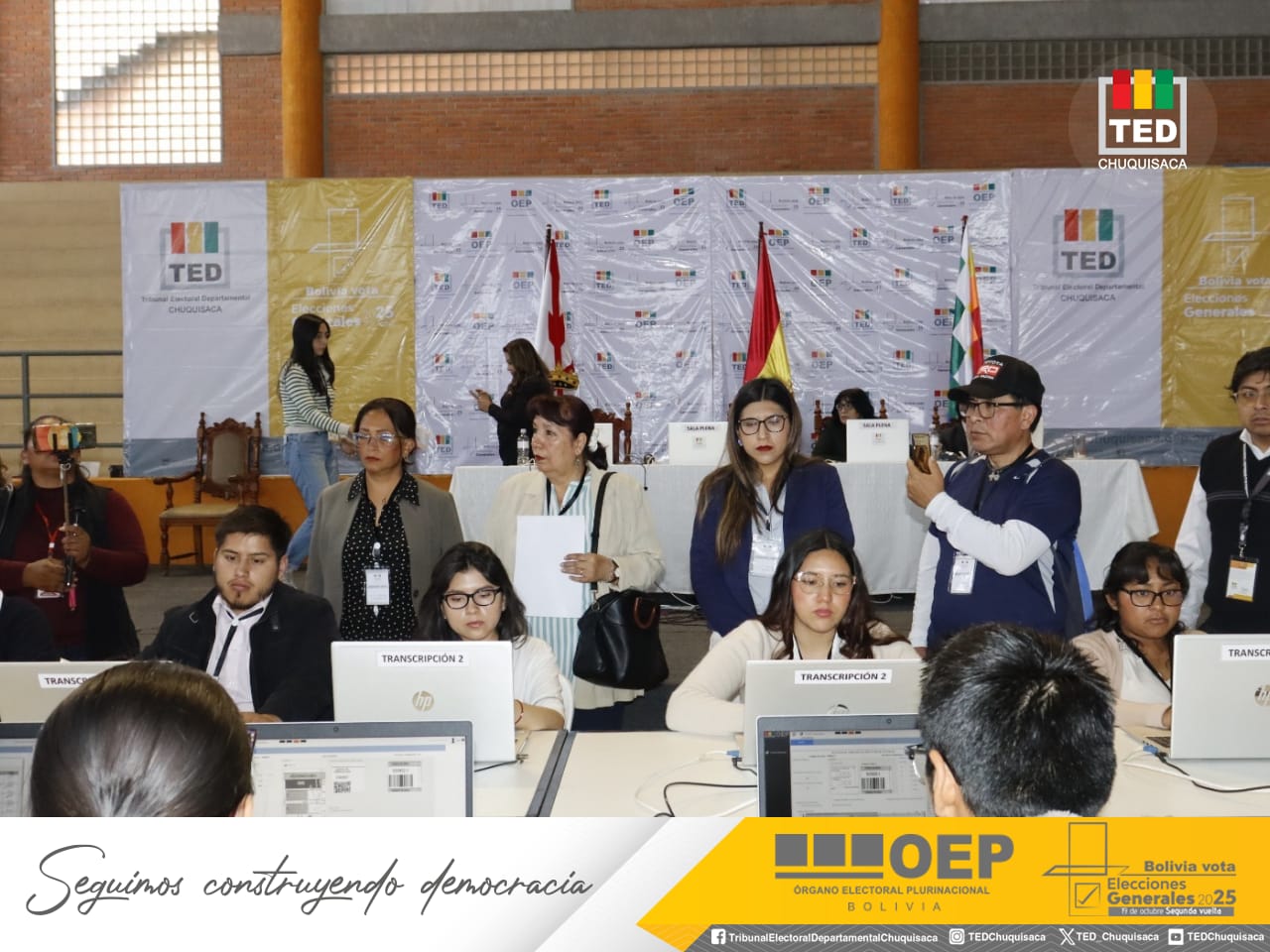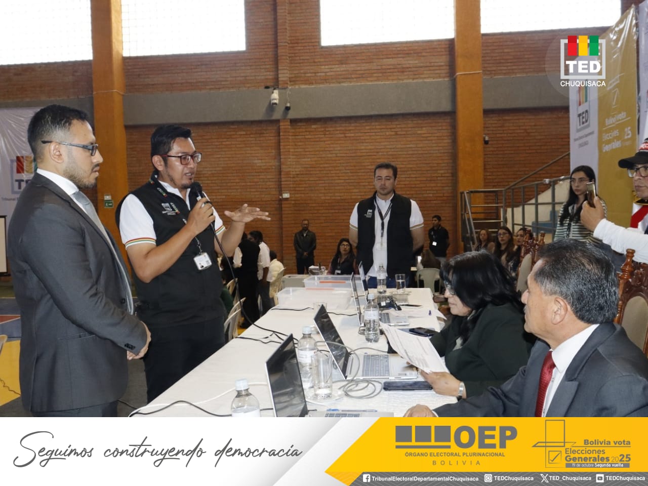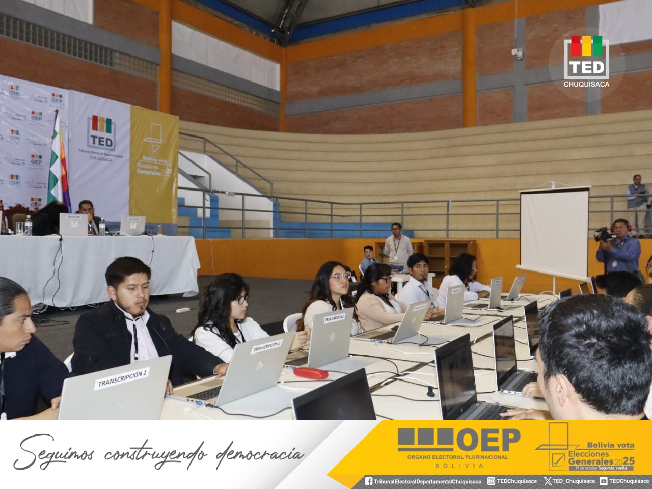 A pocos días de la segunda vuelta, el Tribunal Electoral Departamental (TED) de Chuquisaca realizó este miércoles un simulacro de cómputo departamental con la presencia de medios de comunicación y delegados de las fuerzas políticas que participarán en la elección del 19 de octubre.