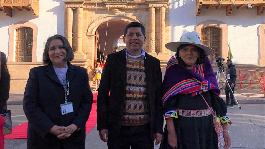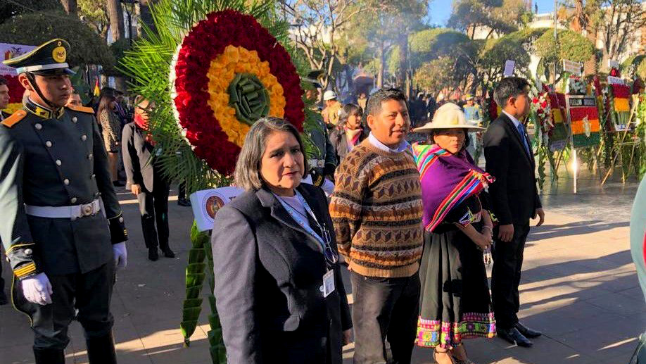 Vocales del TSE, Nancy Gutierrez, Nelly Arista y Tahuichi Tahuichi Quispe rinden homenaje en la Plaza de Sucre por la fundación de la República de Bolivia.