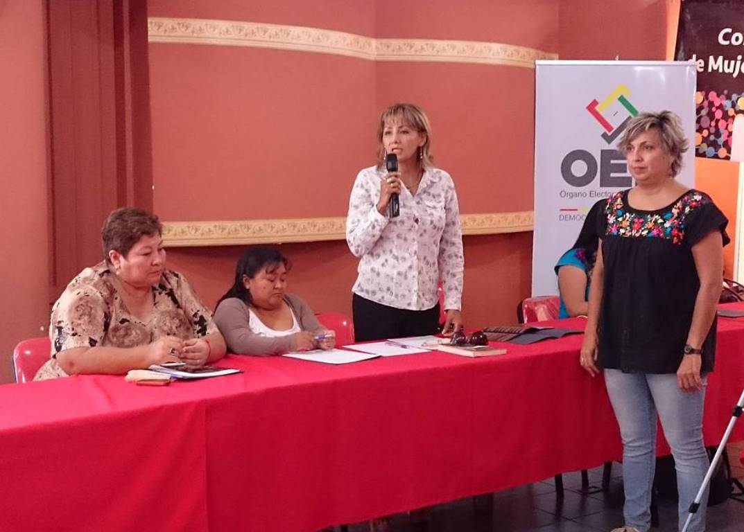 El lunes 13 de febrero en la ciudad de Tarija se llevó a cabo el tercer taller de “Propuestas de organizaciones de mujeres para la construcción de la Ley de Organizaciones Políticas”, que contó con la participación de autoridades departamentales y municipales, representantes de organizaciones políticas, de organizaciones sociales, mujeres autoridades electas (asambleístas departamentales y concejalas), autoridades del TSE, además de la presencia de la nueva directiva de la Brigada Parlamentaria de Tarija (compuesta por cinco mujeres).