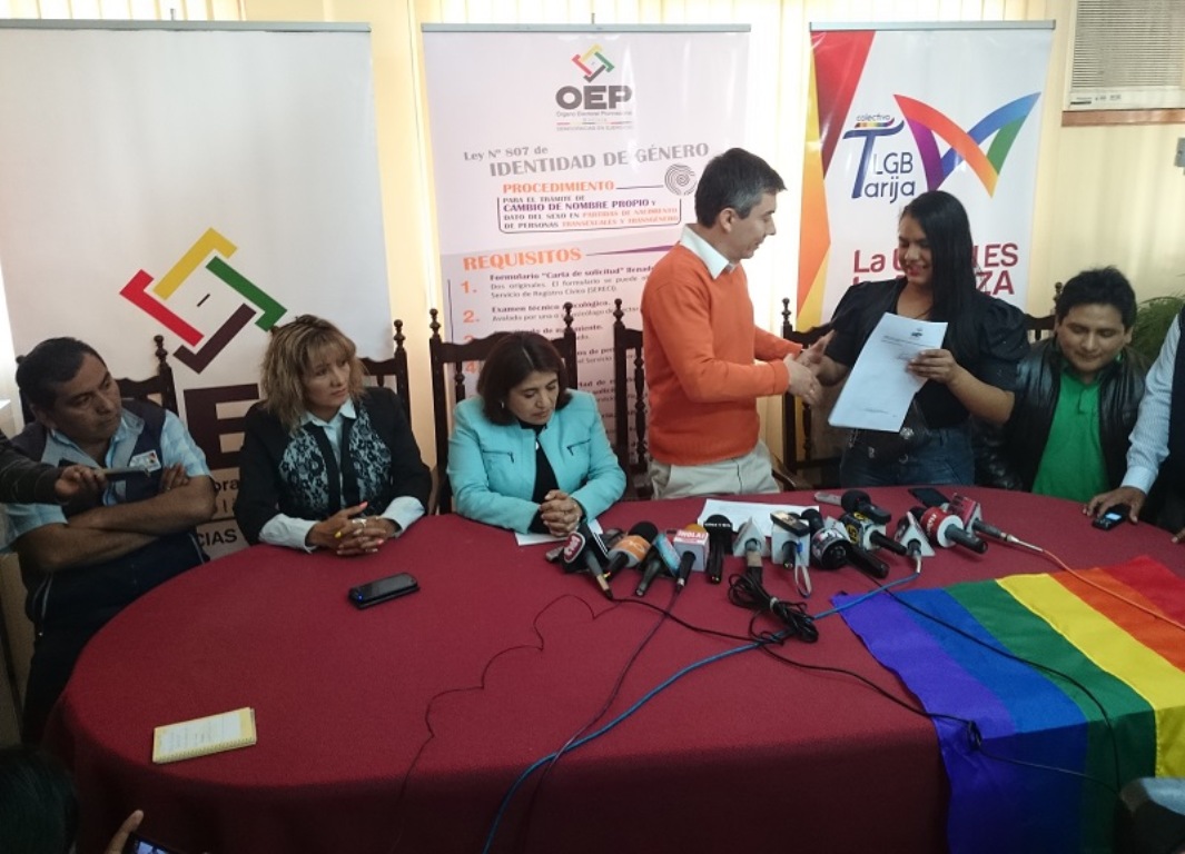 Mediante conferencia de prensa, el director del SERECI Tarija, Alberto Mealla, junto a los vocales del Tribunal Electoral Departamental (TED) de Tarija y el representante del Colectivo TLGB, entregó la Resolución Administrativa TIDG-TJ Nº 001/2016 junto al nuevo certificado de nacimiento con los datos actuales de la ciudadana trans Gilda Rachel.