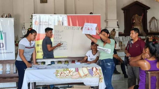 Técnico del Sifde Beni, Carlos Atto capacita a las y los jurados electorales del Comité de Niña, Niño y Adolescente de la localidad de San Pedro.
