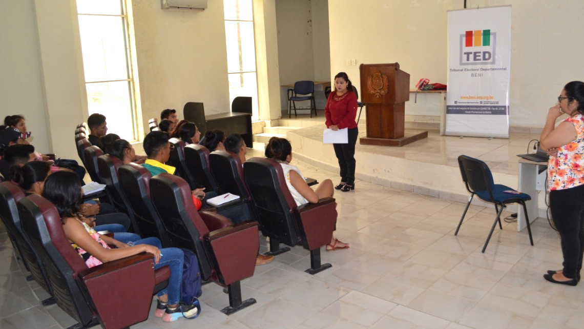 El Tribunal Electoral Departamental (TED) Beni llevó a cabo hoy el conversatorio sobre la democracia intercultural y paritaria destinado a los docentes y estudiantes de la Facultad de Humanidades y Ciencias de la Educación de la Universidad Autónoma del Beni (UAB).
