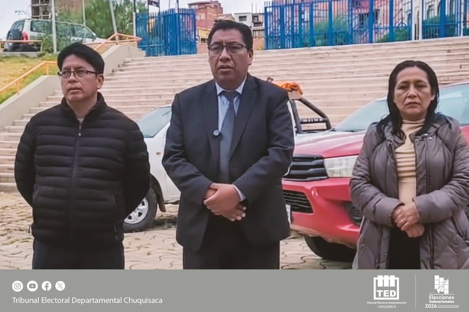 En esta actividad también participaron la vicepresidenta del TED Chuquisaca, Jhenny Ivana Miranda Valverde, y el vocal Gunnar Jorge Vargas Orgaz, quienes resaltaron la labor del personal que se desplaza al área rural con el fin de coadyuvar en la organización de las Elecciones Subnacionales 2026.