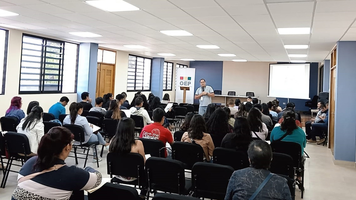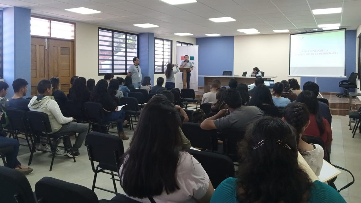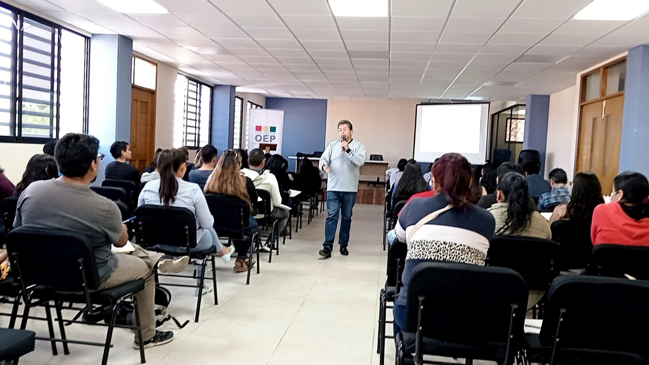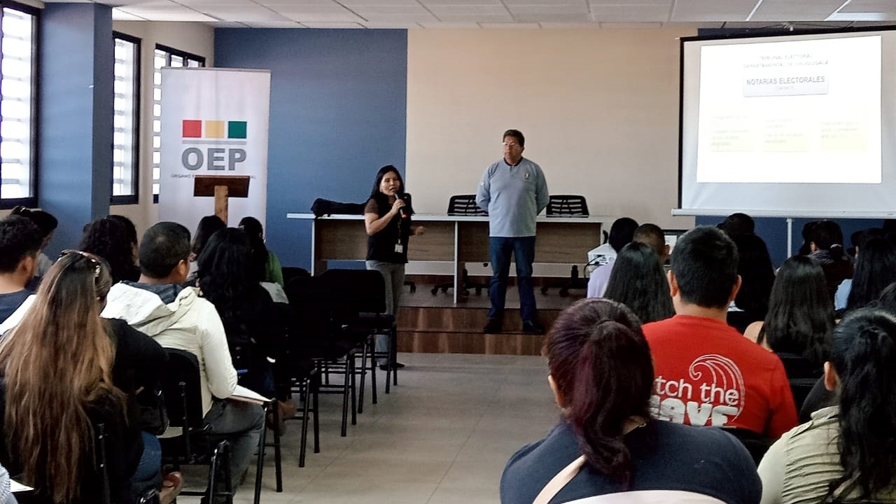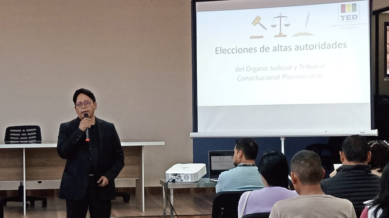 Entre los expositores está el presidente del TED Chuquisaca, Edil Martínez; el vocal Gunnar Vargas; la vocal Lidia Rivas; el responsable de coordinación Sifde, Marcelo Morales; la responsable de la Unidad de Geografía Electoral, Kenndy Mireya Gómez; el jefe de Tecnologías de la Información y Comunicación, Joel Chaira y el técnico de Educación e Investigación Intercultural, Alex Manrique.
