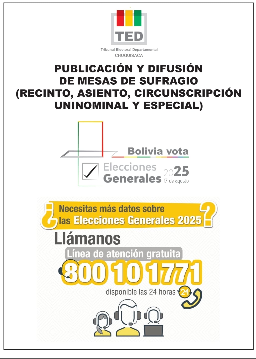 El Tribunal Electoral Departamental (TED) de Chuquisaca publicó este domingo 10 de agosto la nómina de todas las mesas de sufragio que se instalarán en el departamento para las Elecciones Generales del 17 de agosto.