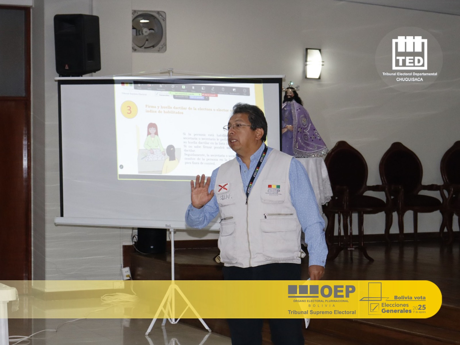 El rol de juezas y jueces electorales resulta fundamental para garantizar el desarrollo pacífico y democrático de las Elecciones Generales, tanto para la población chuquisaqueña como para la boliviana. Por ello, el TED Chuquisaca continúa realizando esta y otras actividades de socialización y capacitación con distintos actores que desempeñarán un papel indispensable en la jornada electoral del 17 de agosto.