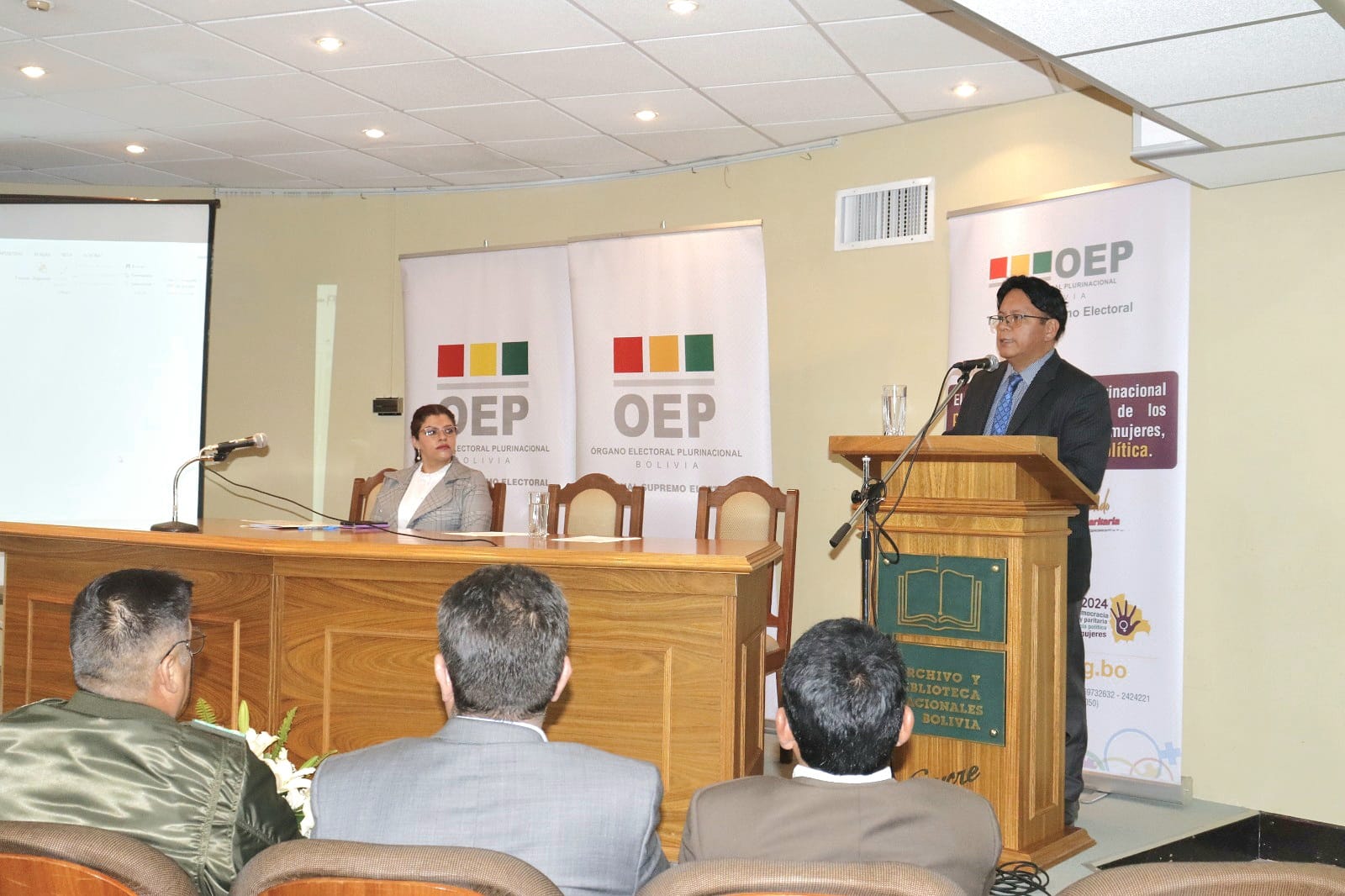 Finalmente, informó que al momento se realiza la restauración del archivo del registro cívico, como un aporte al bicentenario del Estado Plurinacional de Bolivia.