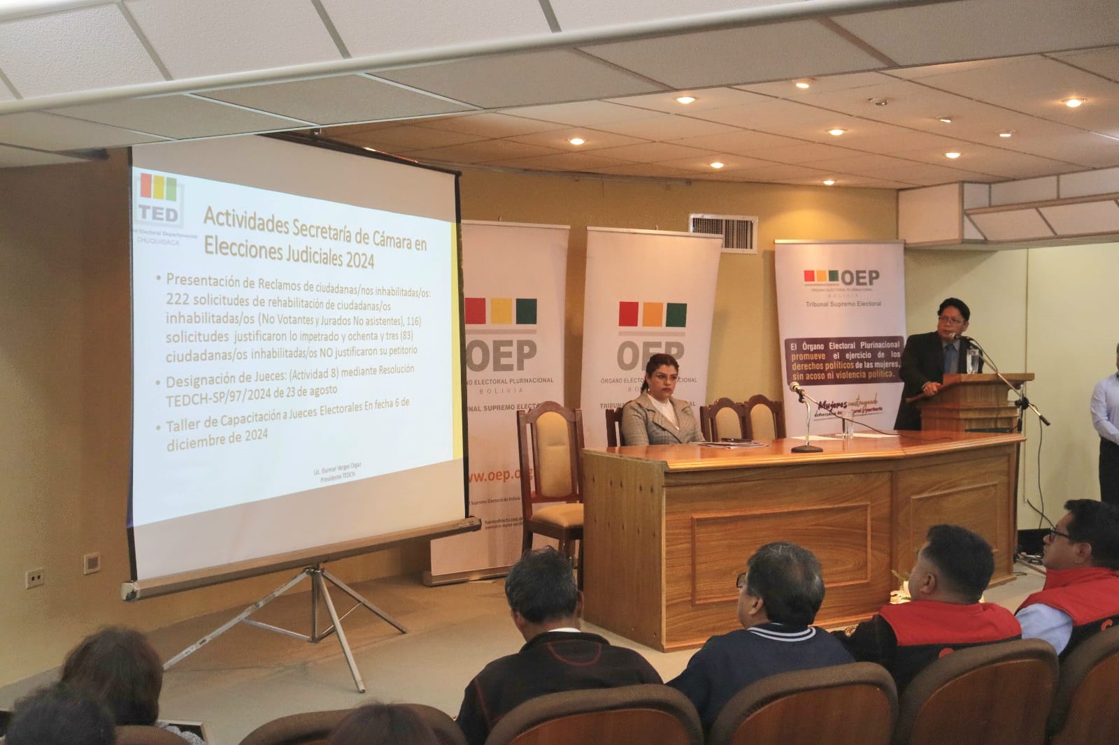 Respecto al proceso de Elecciones Judiciales 2024, resaltó el trabajo con alta calidad técnica, entre estos el trabajo de atención de denuncias e informes de oficio respecto a las faltas cometidas principalmente en la difusión de méritos de candidatas y candidatos, la capacitación a los actores del proceso electoral, entre ellos, jurados electorales servidores públicos y sociedad civil, la difusión de méritos a través de medios de comunicación tradicionales, en red y mediante foros presenciales; por otro lado, resaltó el trabajo logístico de producción, organización, traslado de maletas electorales y el retorno de éstas, especialmente de los sobres “A”, garantizando la transparencia del proceso electoral a través de la aplicación de la cadena de custodia en cada una de estas fases, con acompañamiento policial y militar.