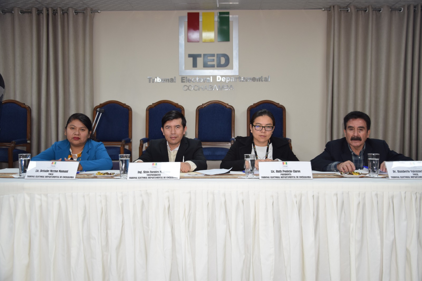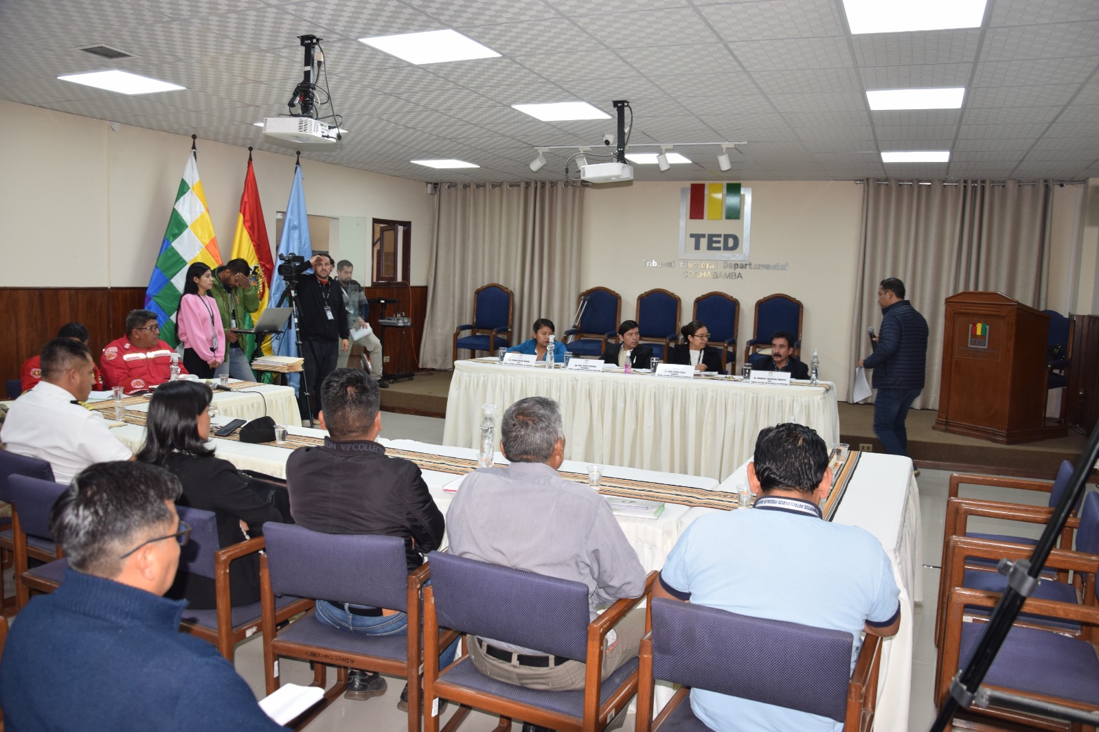 Los representantes de las instituciones acordaron la conformación de mesas técnicas de trabajo para ultimar los detalles de la planificación que contempla el antes, durante y después del proceso electoral, los vocales de la Sala Plena del TED Cochabamba participaron en este primer encuentro y atendieron algunas inquietudes referidas al aspecto logístico.