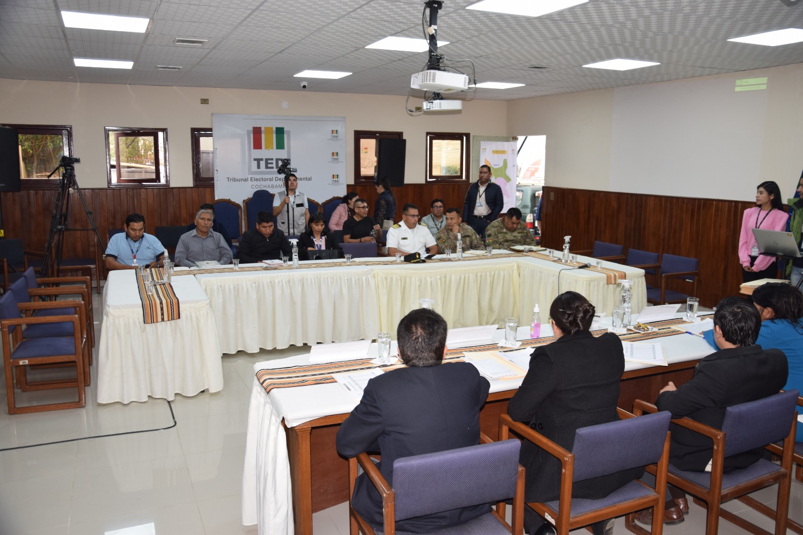 Autoridades del Tribunal Electoral Departamental (TED) de Cochabamba se reunieron este miércoles 30 de octubre con miembros de las Fuerzas Armadas y Policía, con el objetivo de coordinar el protocolo de seguridad de la cadena de custodia de los materiales electorales que se utilizarán el 1 de diciembre.