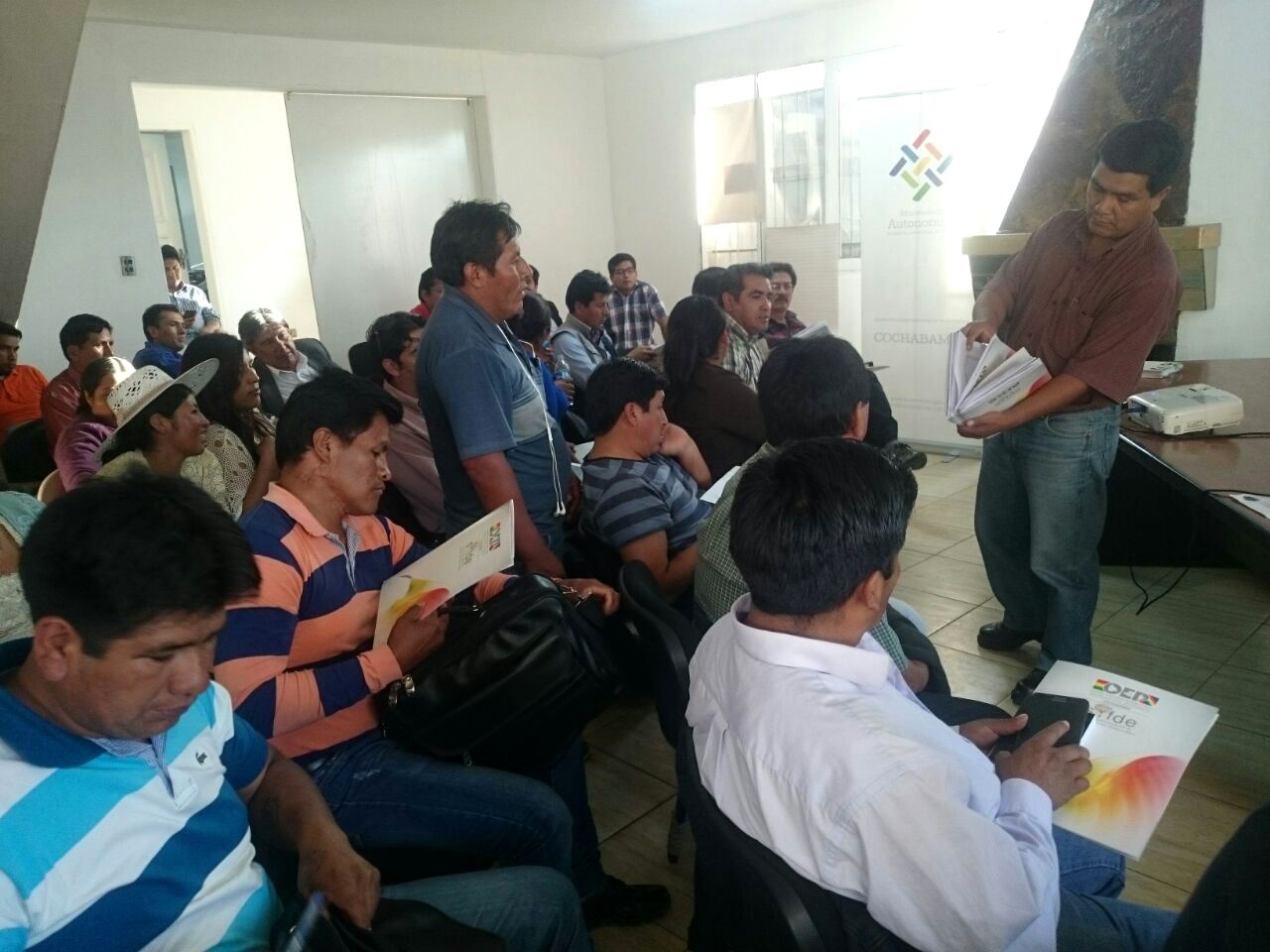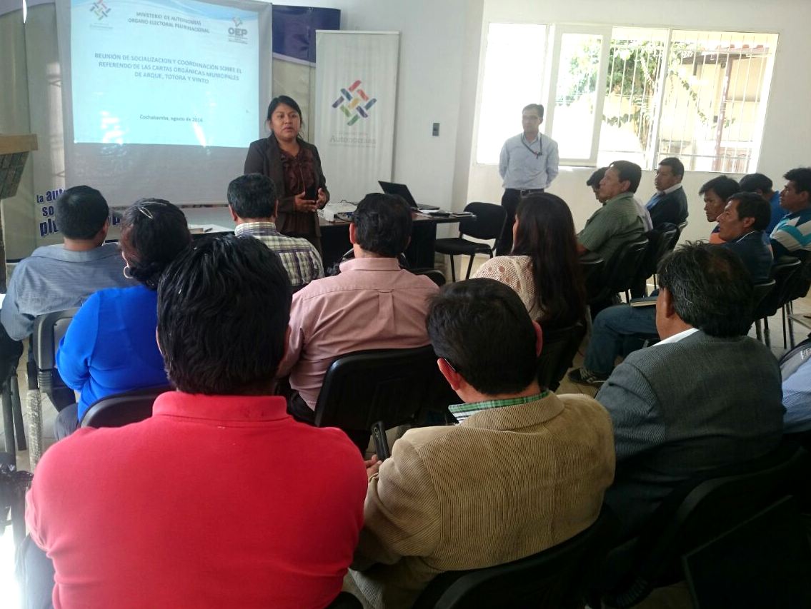 La Presidenta del Tribunal Electoral Departamental (TED) de Cochabamba, Betsabé Merma, se reunió ayer con el Viceministro de Autonomías Departamentales y Municipales, Emilio Rodas, y con autoridades de los Gobiernos Municipales de Totora, Arque y Vinto a fin de coordinar las acciones para la socialización de los proyectos de Cartas Orgánicas de estos municipios que el 20 de noviembre acudirán al Referendo Autonómico.