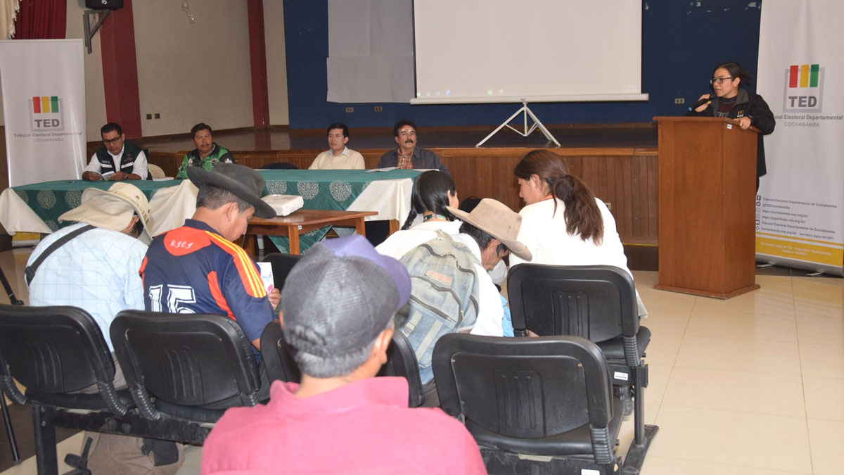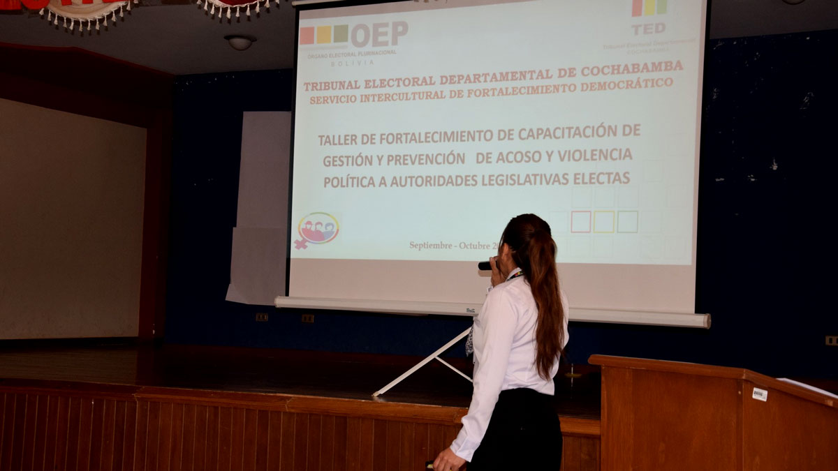 La presidenta del Tribunal Electoral Departamental (TED) Cochabamba, Ruth Pontejo, inauguró el ciclo de talleres de prevención y fortalecimiento de capacidades de gestión contra el Acoso y Violencia Política a autoridades legislativas electas de la región del Cono Sur de Cochabamba, el taller se realizó en el municipio de Mizque, el lunes 11 de septiembre.