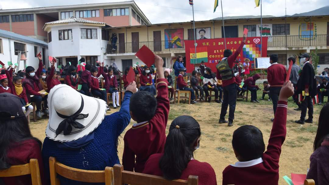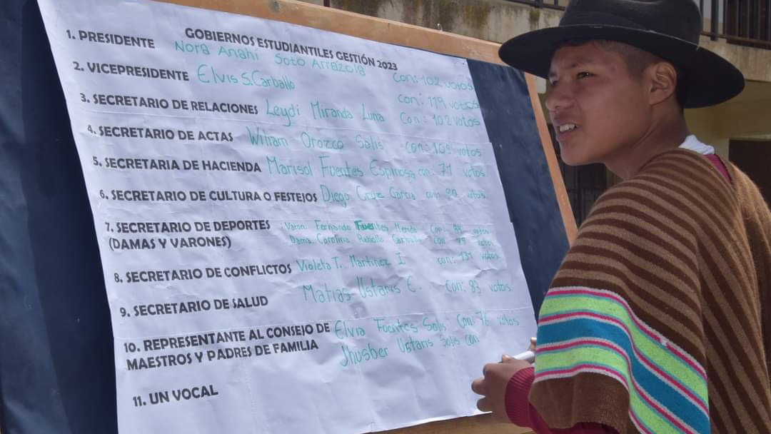 Las y los estudiantes de la unidad educativa 2 de Agosto - Fe y Alegría, de Sapanani, distrito educativo del municipio de Sacaba, eligieron como su presidenta a la estudiante Nora Anahí Soto a través de una asamblea general estudiantil, como mecanismo de la democracia comunitaria, donde obtuvo 102 votos. El Tribunal Electoral Departamental (TED) de Cochabamba acompañó el proceso de capacitación y elección mediante el Servicio Intercultural de Fortalecimiento Democrático (Sifde).