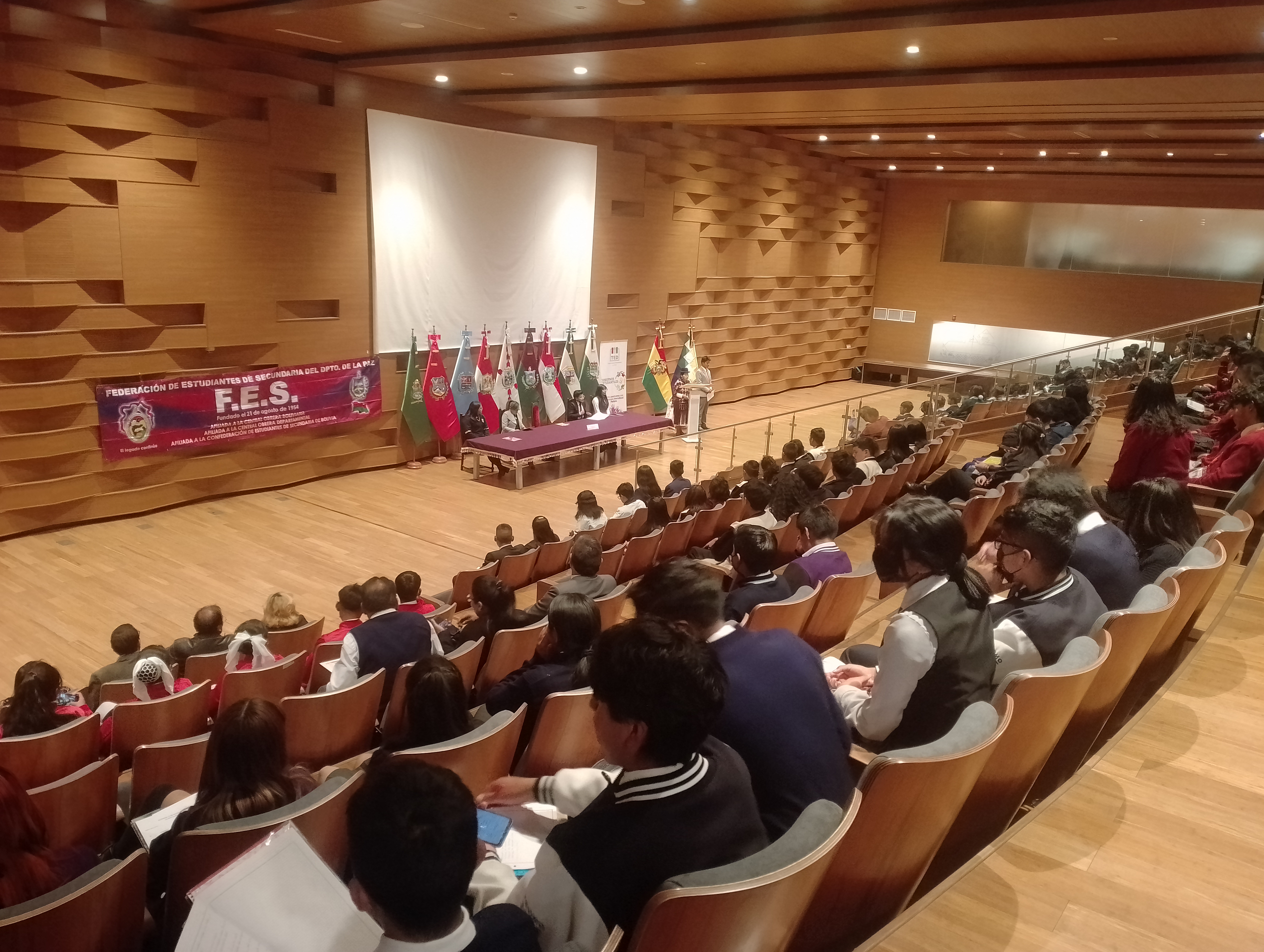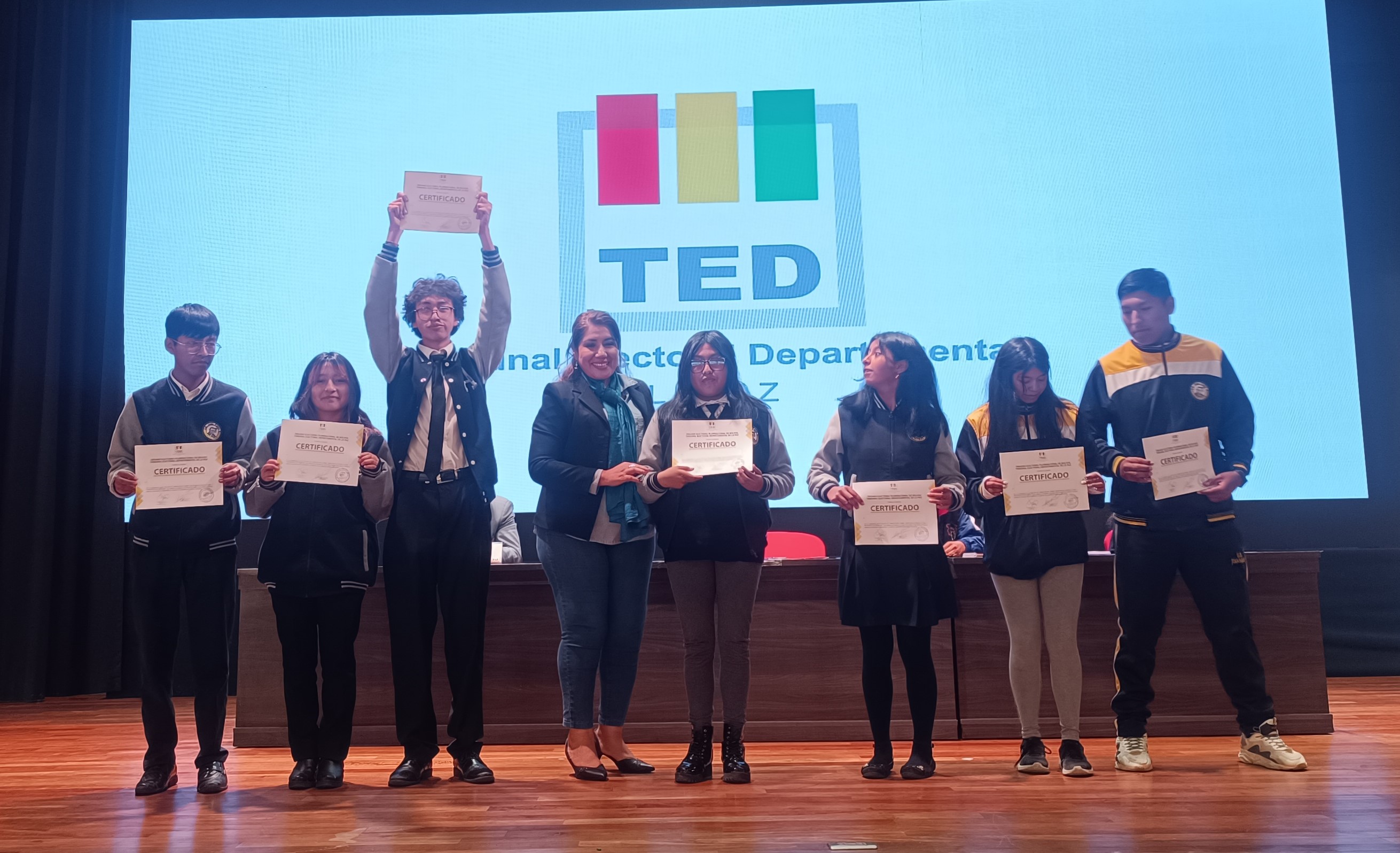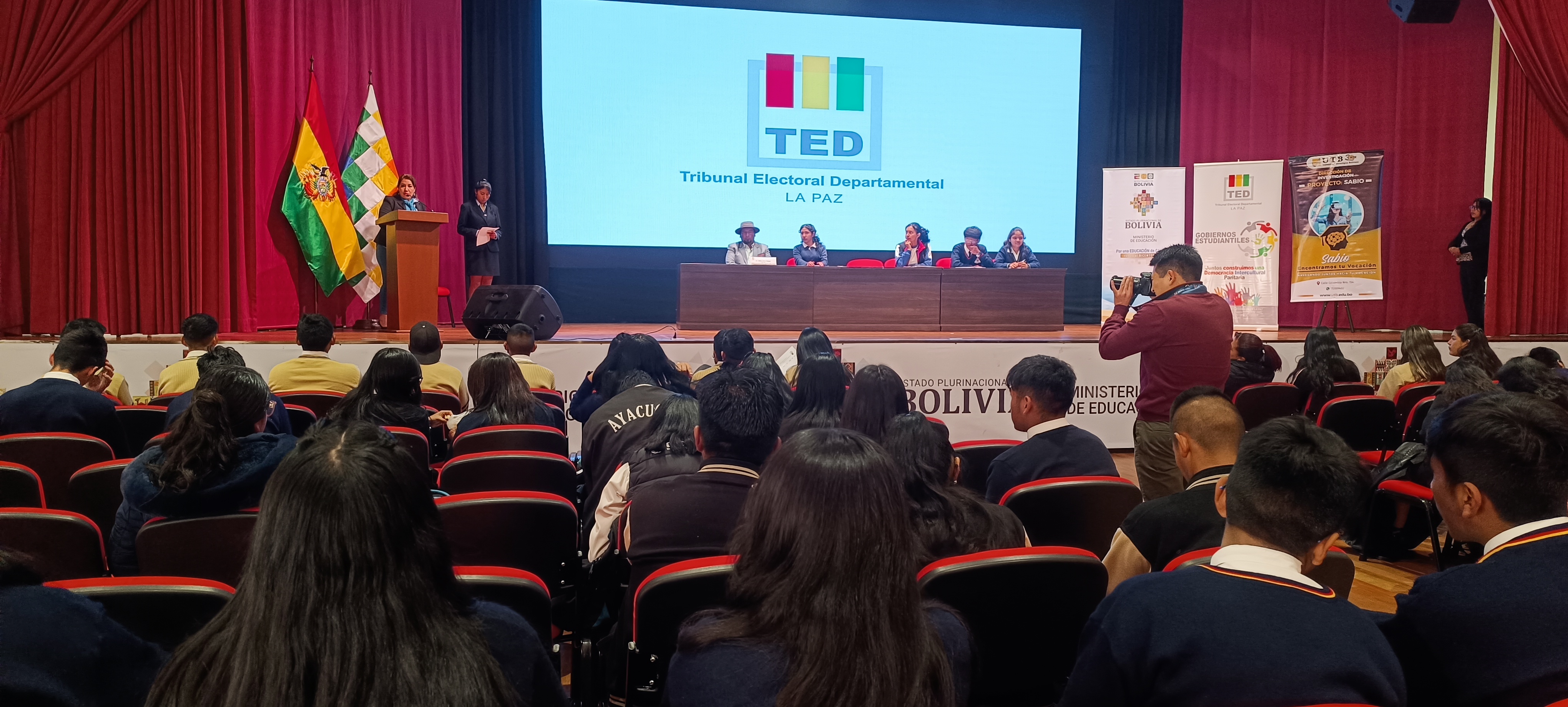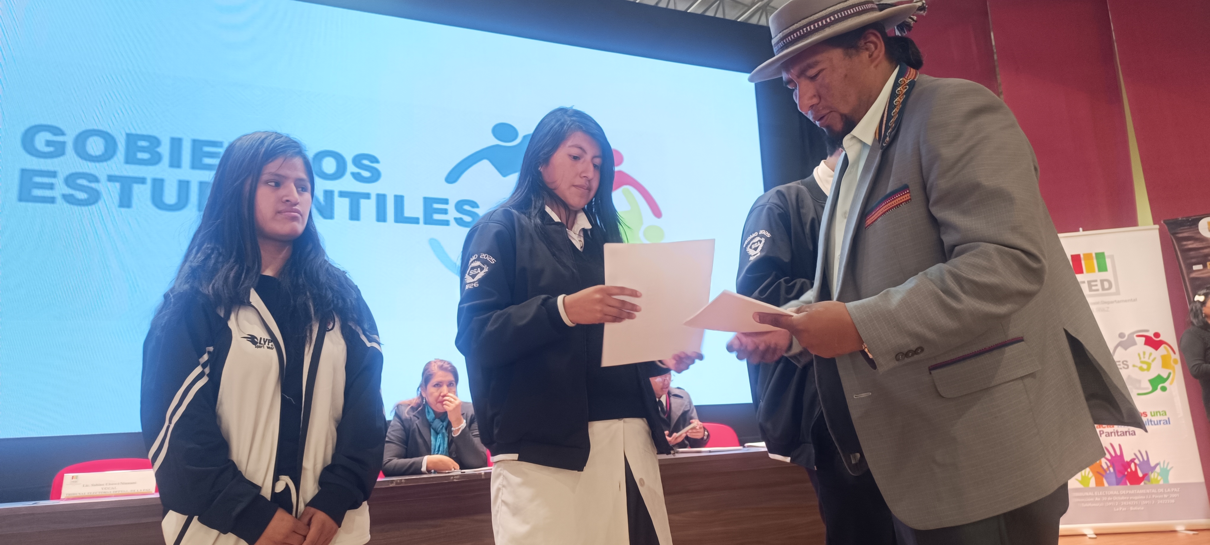 El Tribunal Electoral Departamental (TED) de La Paz, a la cabeza de sus autoridades, acompañó a la Federación de Estudiantes de Secundaria (FES) en la posesión y acreditación de más de 60 gobiernos estudiantiles de diferentes unidades educativas de los distritos 1, 2 y 3 del municipio de La Paz.