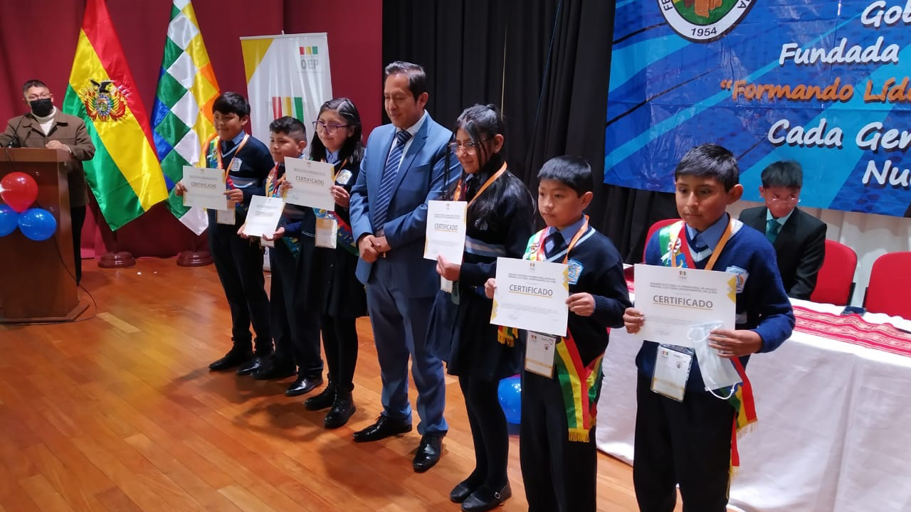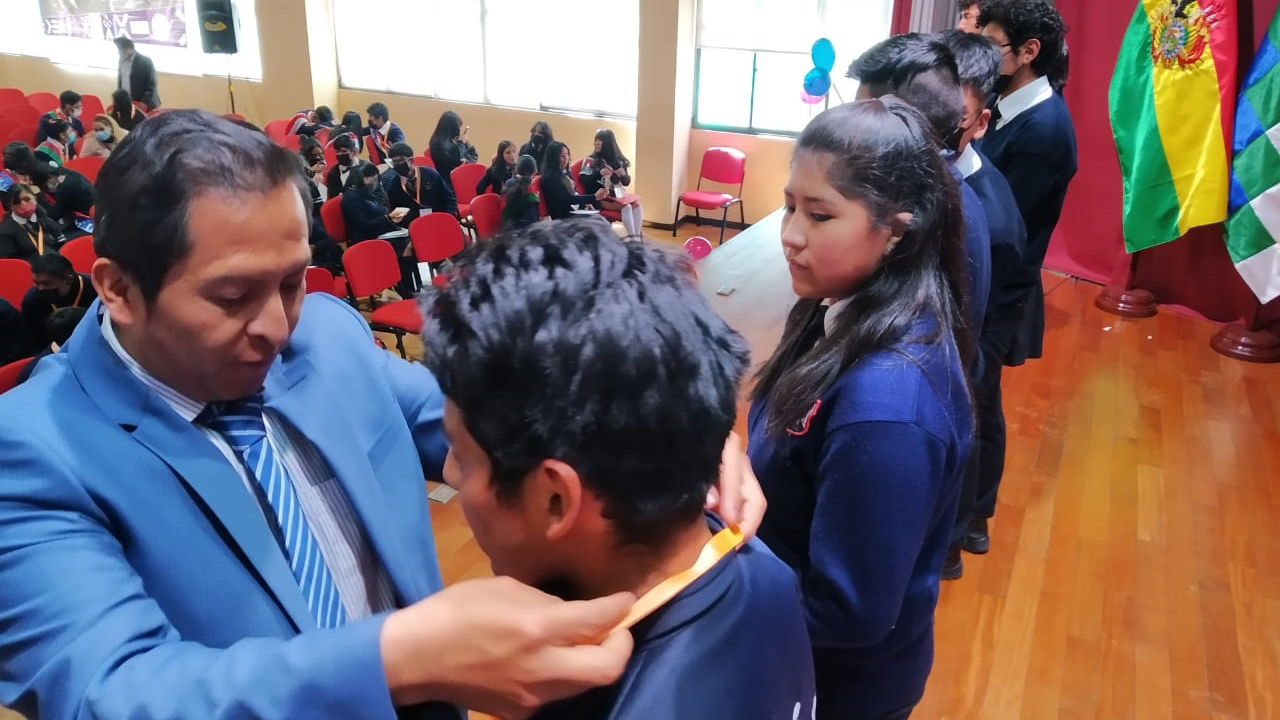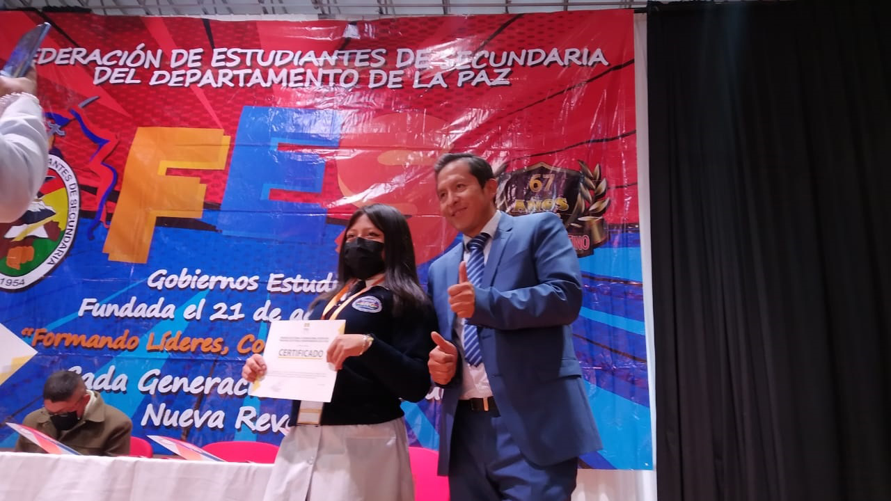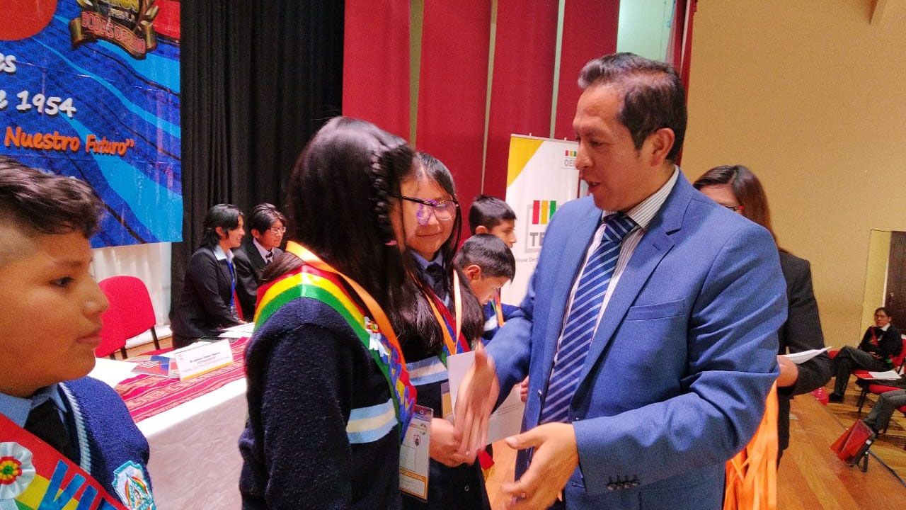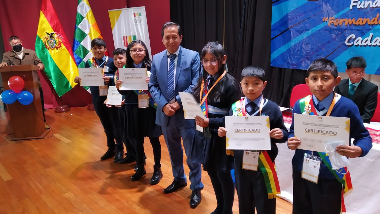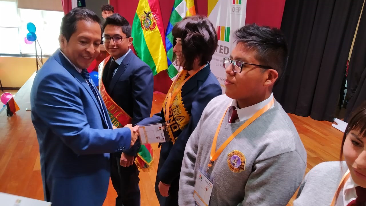 Vicepresidente del TED La Paz, Antonio Condori entrega credenciales a los nuevos líderes de los gobiernos estudiantes de unidade educativas paceñas.